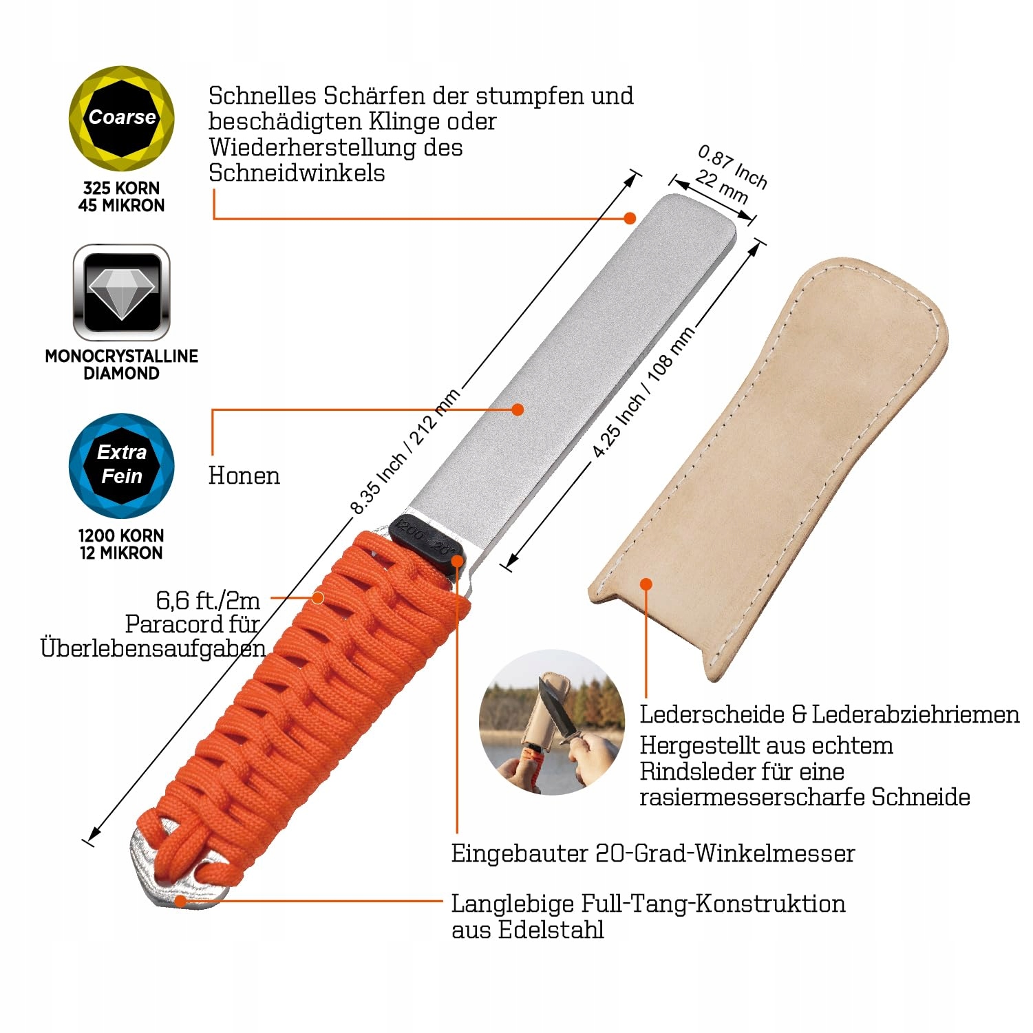 Skórzana pochewka z prawdziwej skóry bydlęcej może służyć jako pasek skórzany i nadać polerowane wykończenie dla ostrych jak brzytwa krawędzi. 2 m odpinany paracord w uchwycie do zadań survivalowych.
