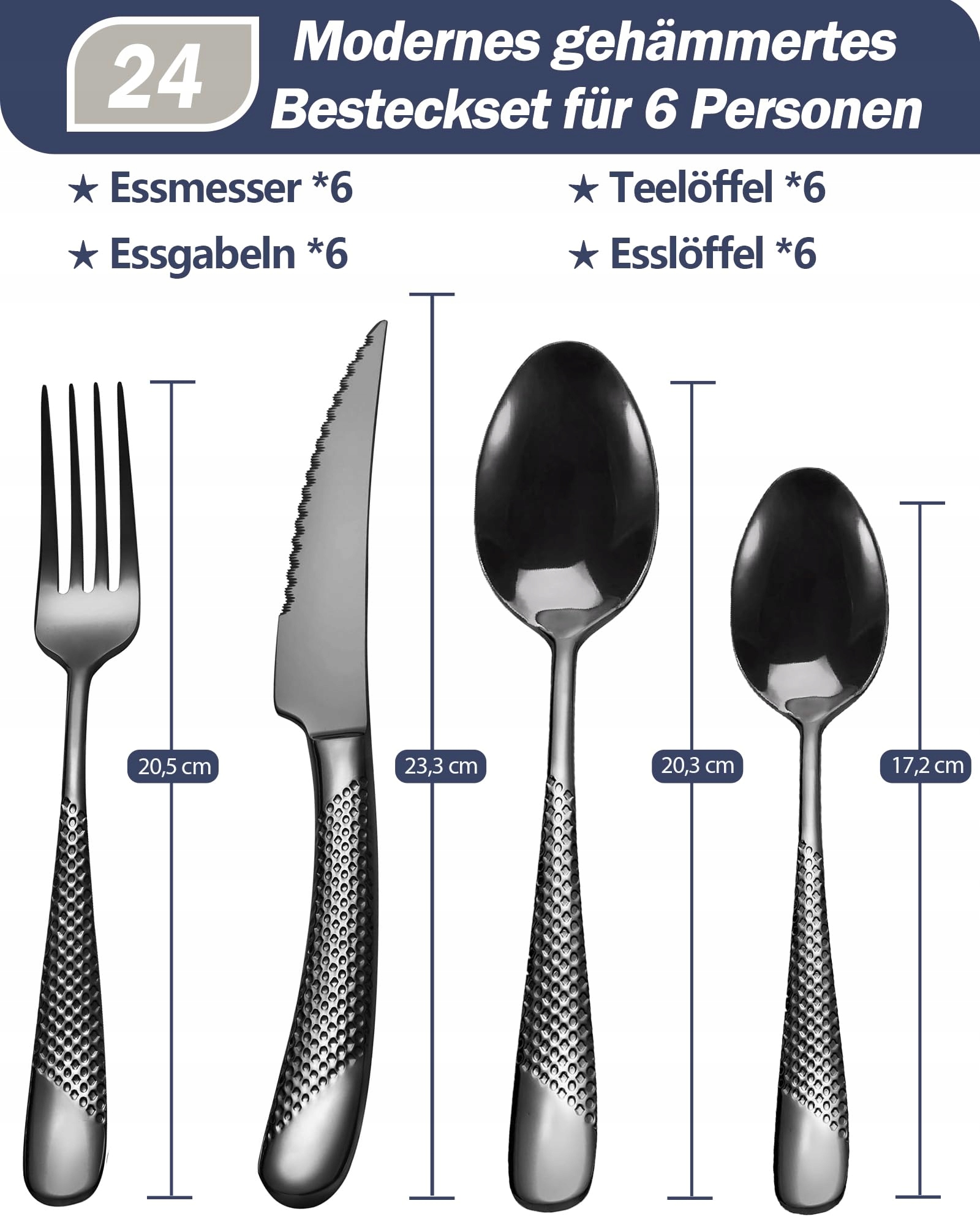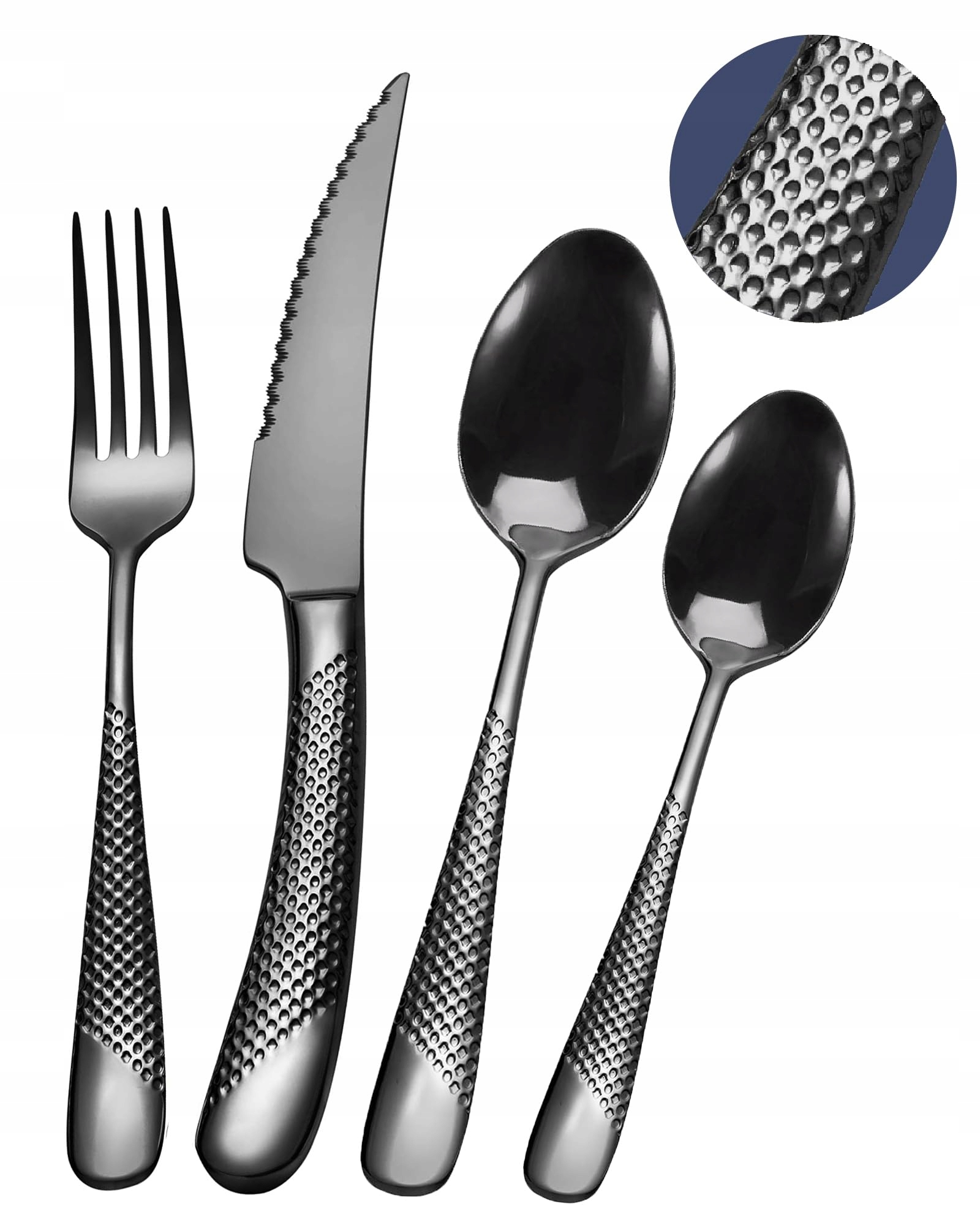 SZTUCĆCE DLA 6 OSÓB: Ten młotkowany zestaw sztućców jest odpowiedni dla większości 6-osobowych rodzin. Elegancki design i najwyższa jakość czynią ten zestaw idealnym do kuchni, restauracji, na wydarzenia i do codziennego użytku.