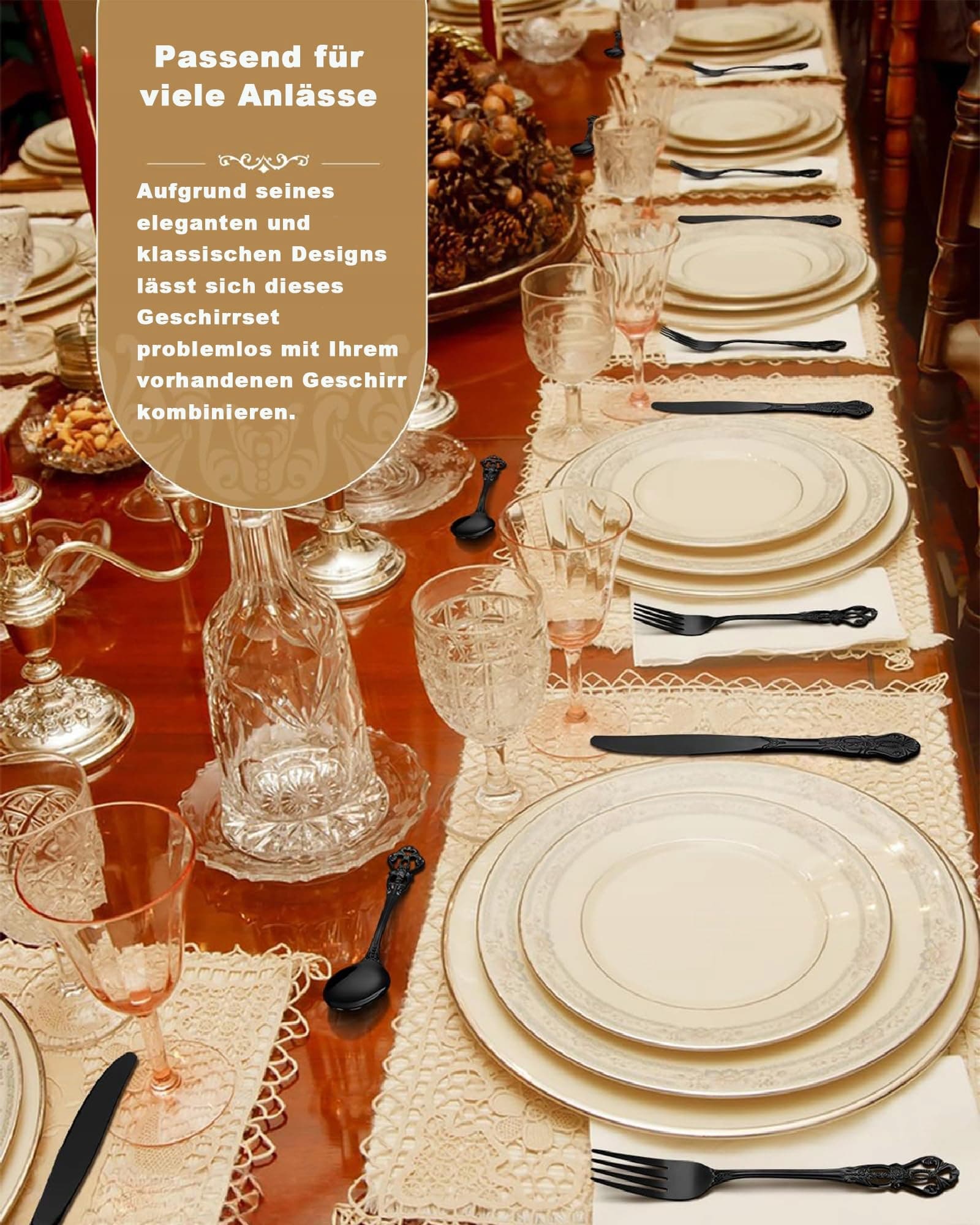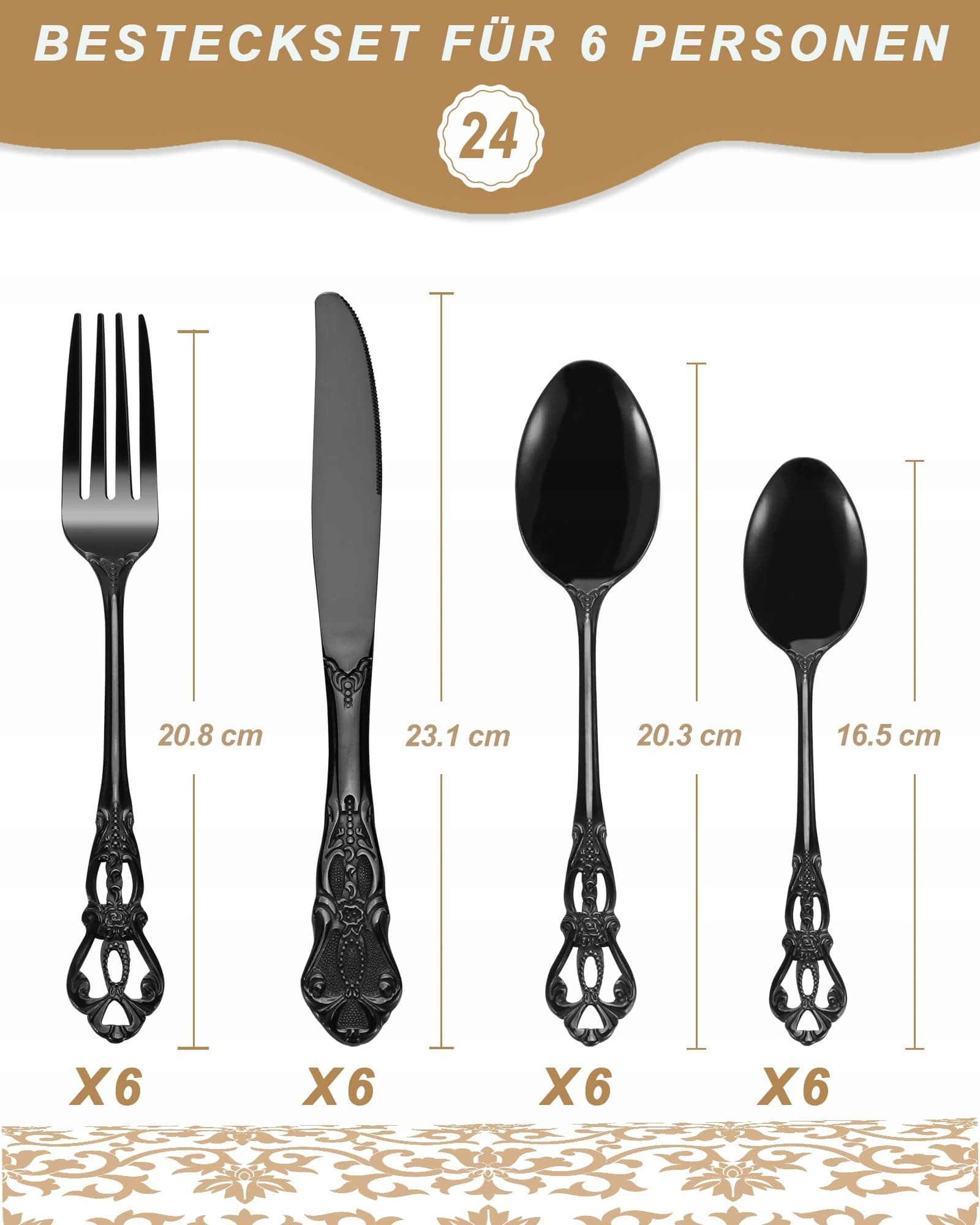 SHEUMNT Retro czarny zestaw sztućców dla 6 osób, piękny 24-częściowy zestaw ze stali nierdzewnej, serwis dla 6 osób, zestaw przyborów, widelec, łyżka, nóż, antyczny zestaw sztućców barokowych