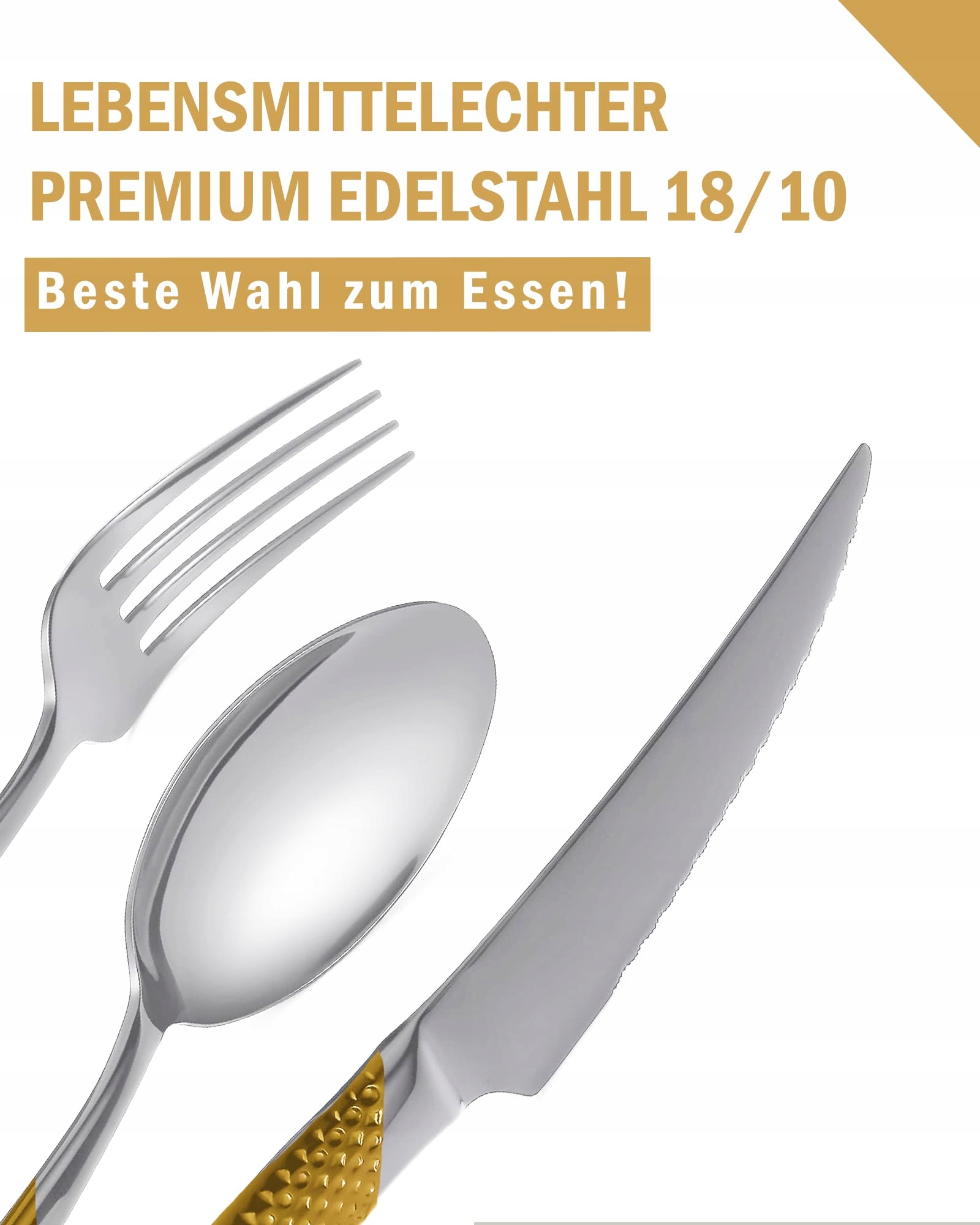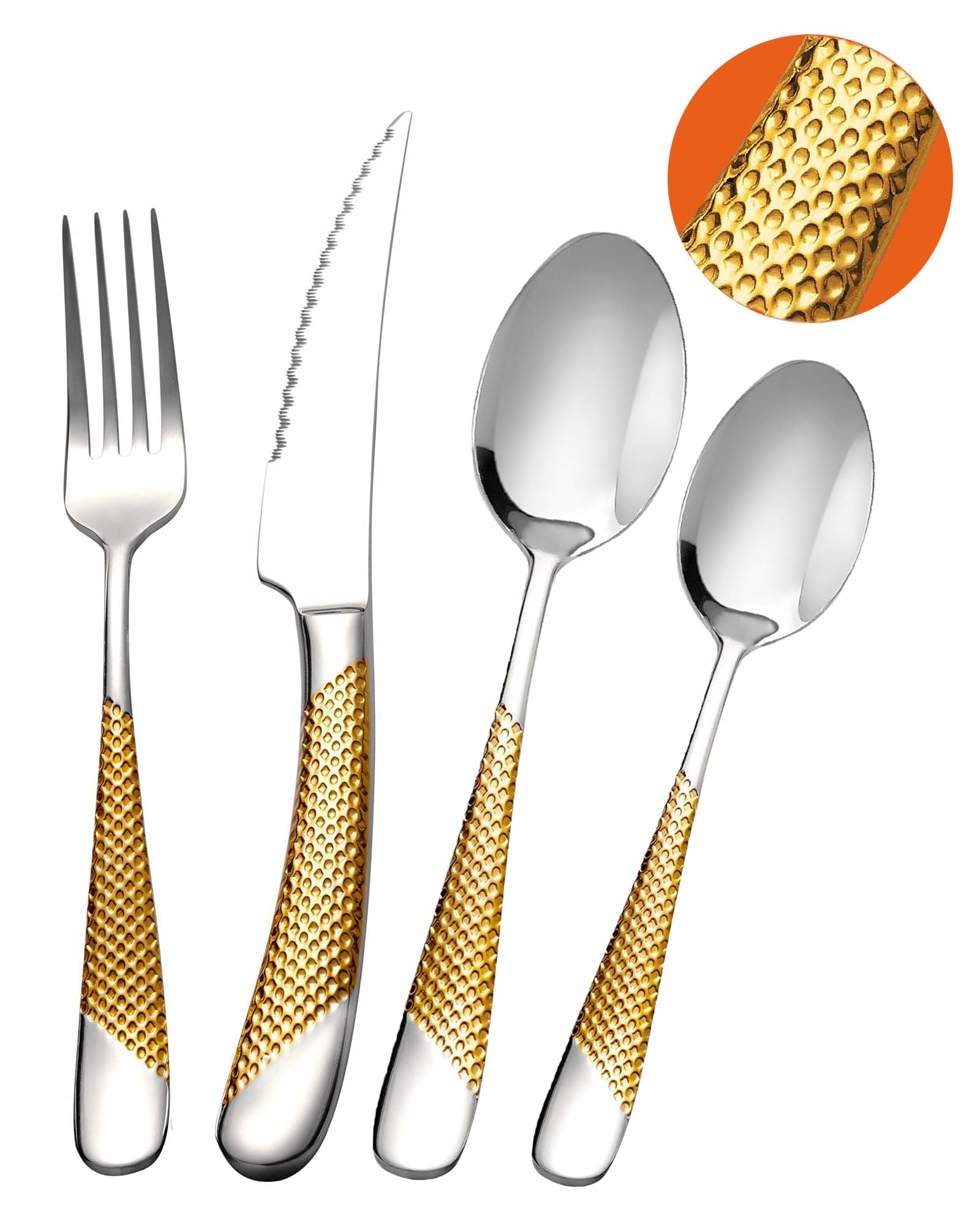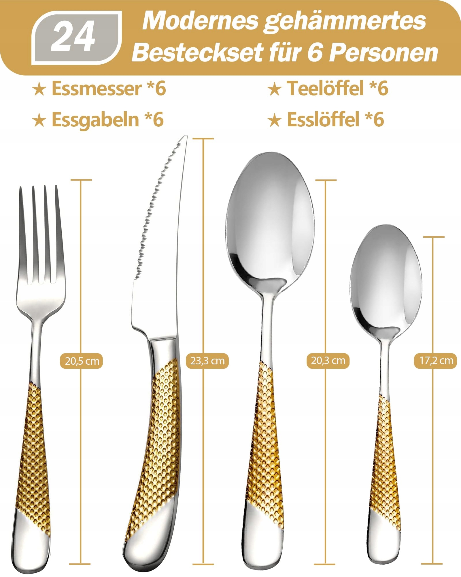 SZTUCĆCE DLA 6 OSÓB: Ten młotkowany zestaw sztućców jest odpowiedni dla większości 6-osobowych rodzin. Elegancki design i najwyższa jakość czynią ten zestaw idealnym do kuchni, restauracji, wydarzeń i codziennego użytku.