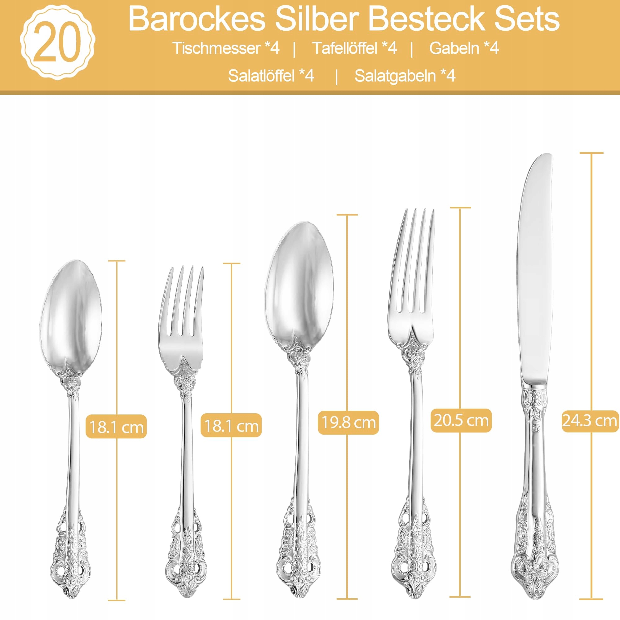 SHEUMNT Zestaw Sztućców Barokowych 18/10 ze Stali Nierdzewnej 20 Części | Premium Supply