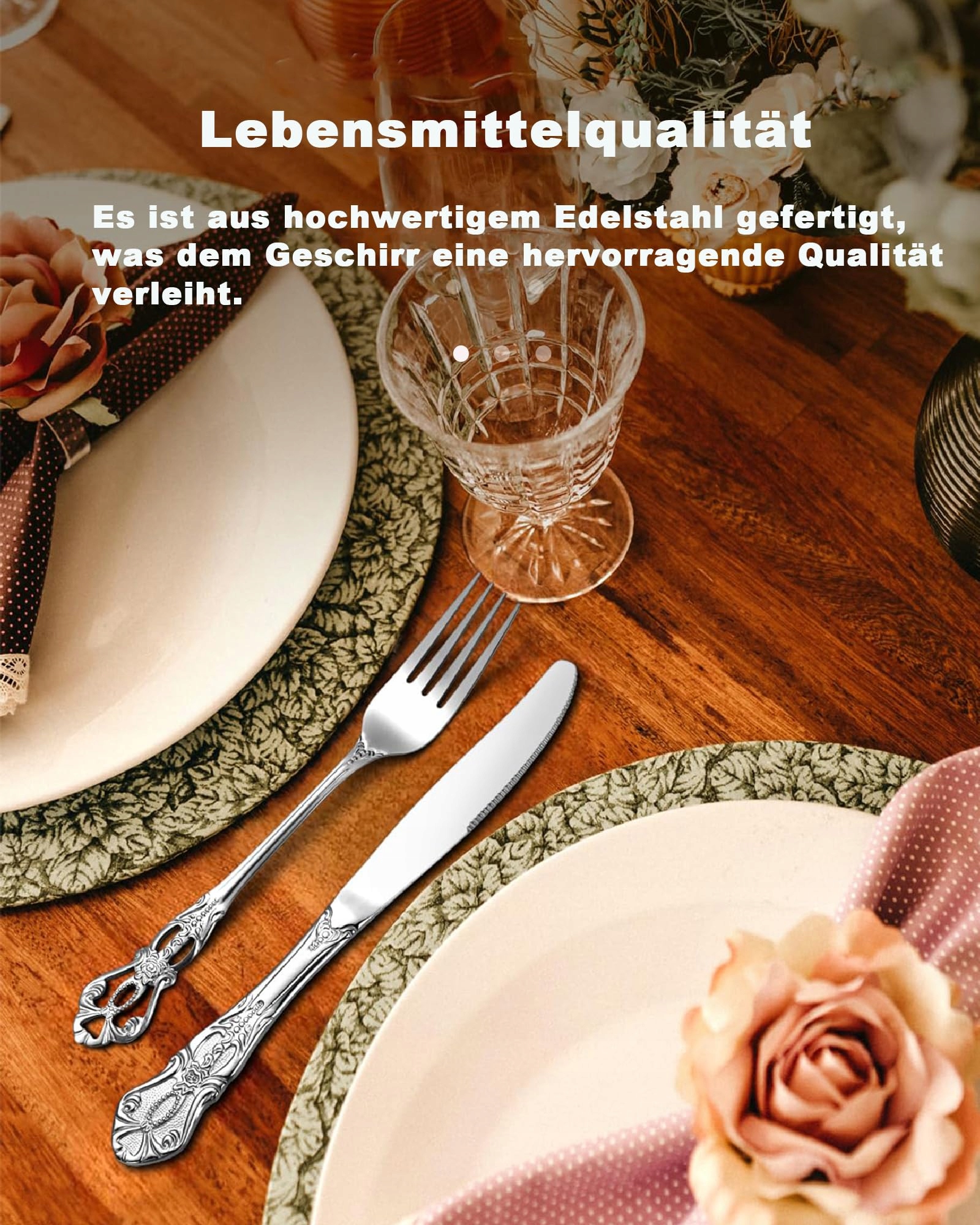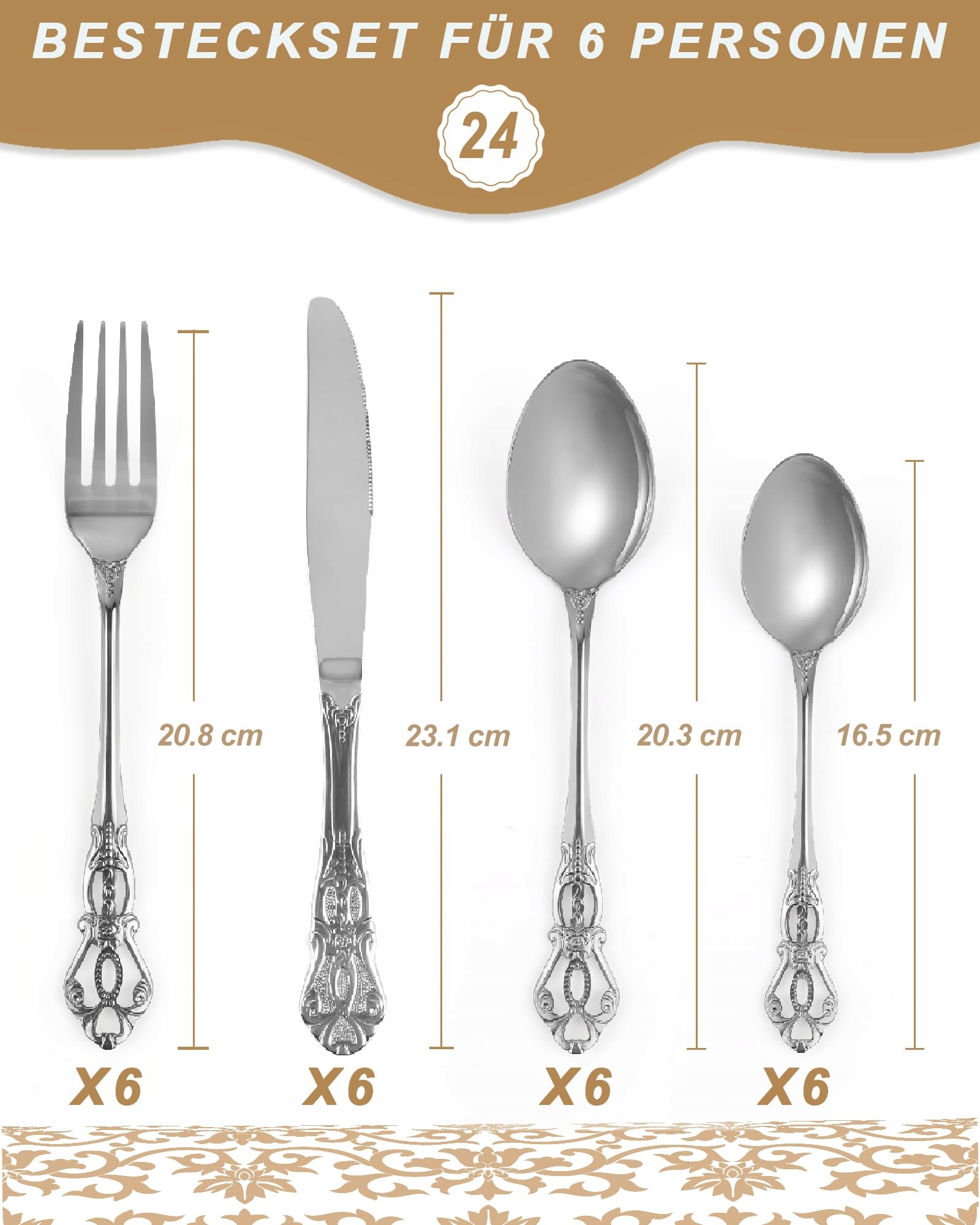 SHEUMNT Retro Srebrny Zestaw Sztućców dla 6 osób, Piękny 24-częściowy zestaw ze stali nierdzewnej, Serwis dla 6 osób, Zestaw przyborów, Widelec, Łyżka, Nóż, antyczny zestaw sztućców barokowych