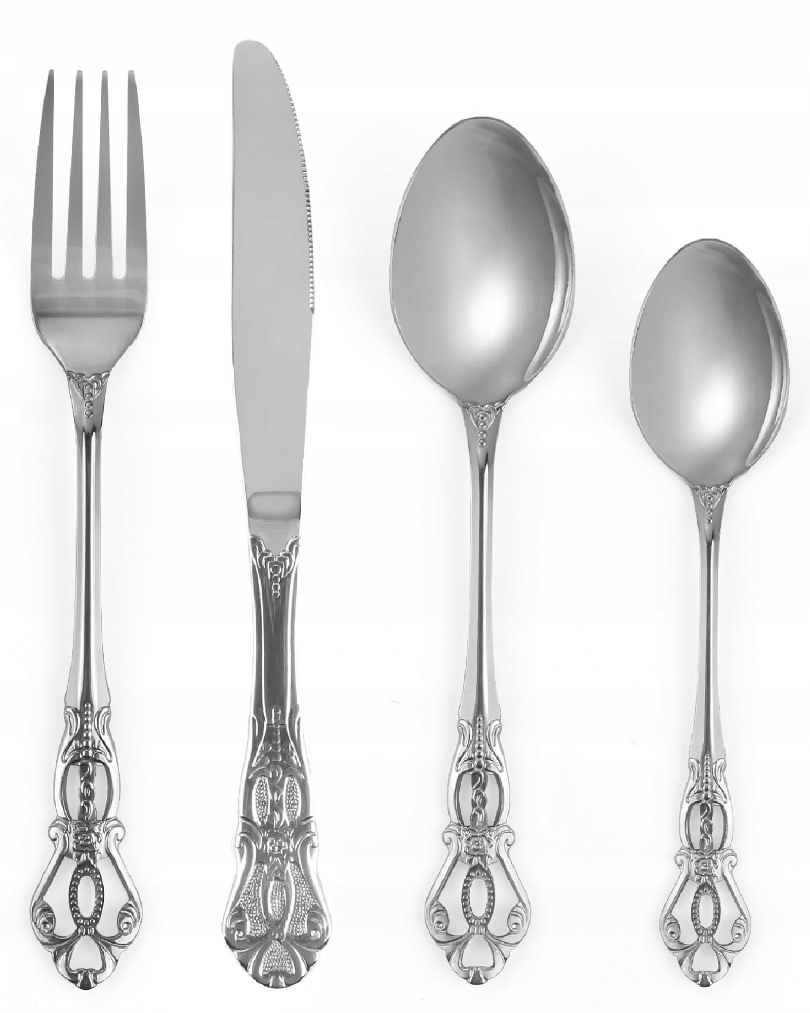 W ZESTAWIE: 24-częściowy zestaw sztućców dla 6 osób. Zestaw zawiera po 4 sztuki każdego rodzaju: nóż, widelec, łyżka i łyżeczka do herbaty.