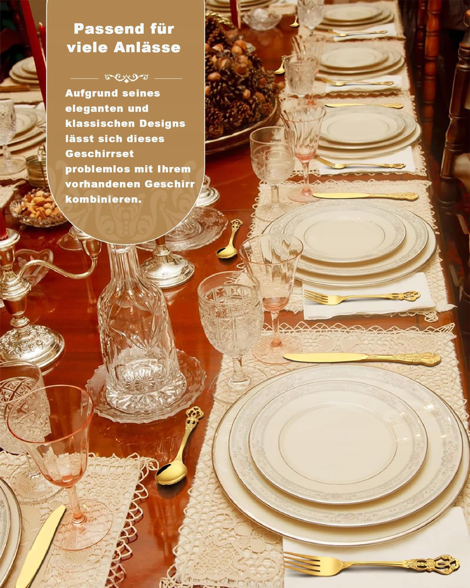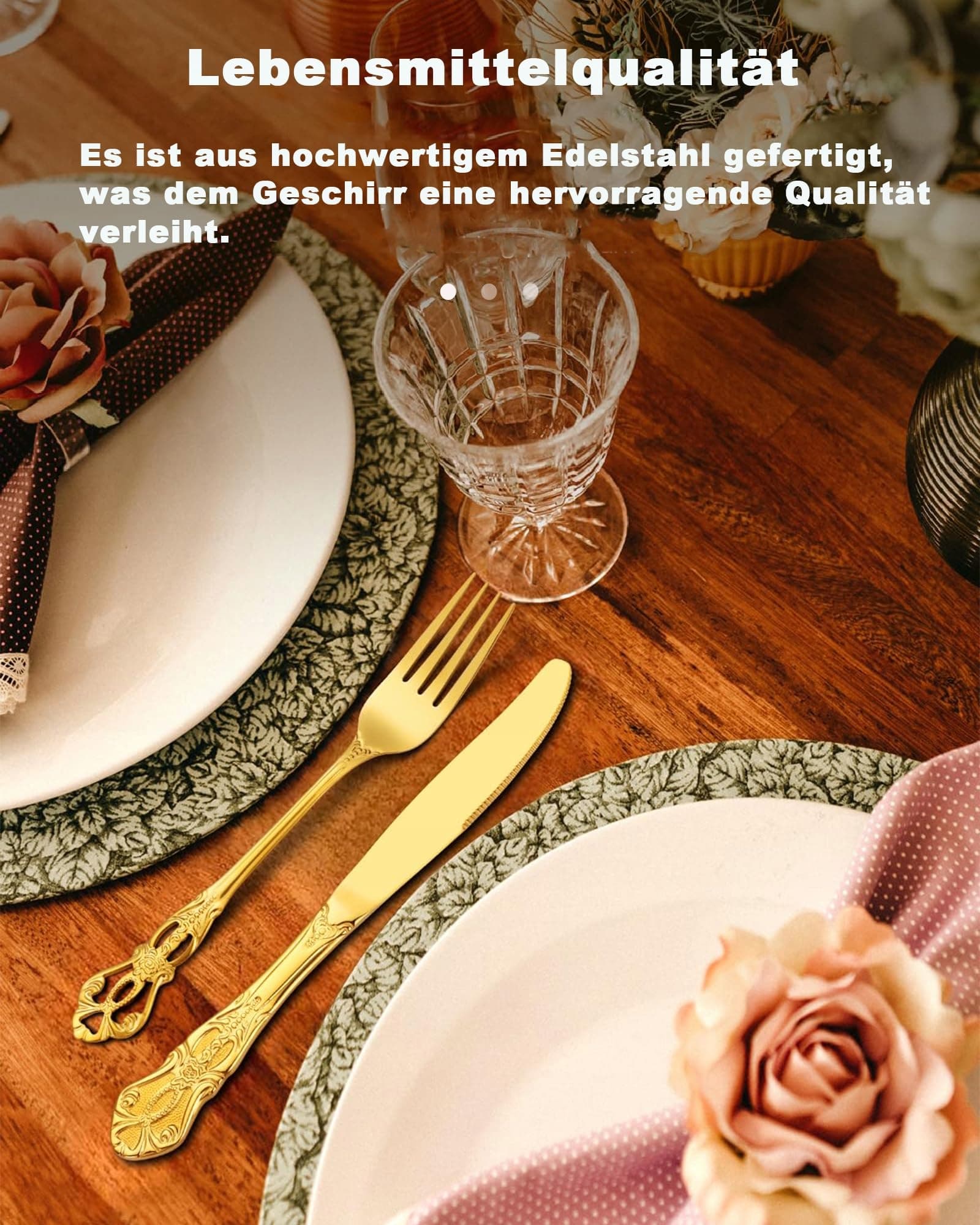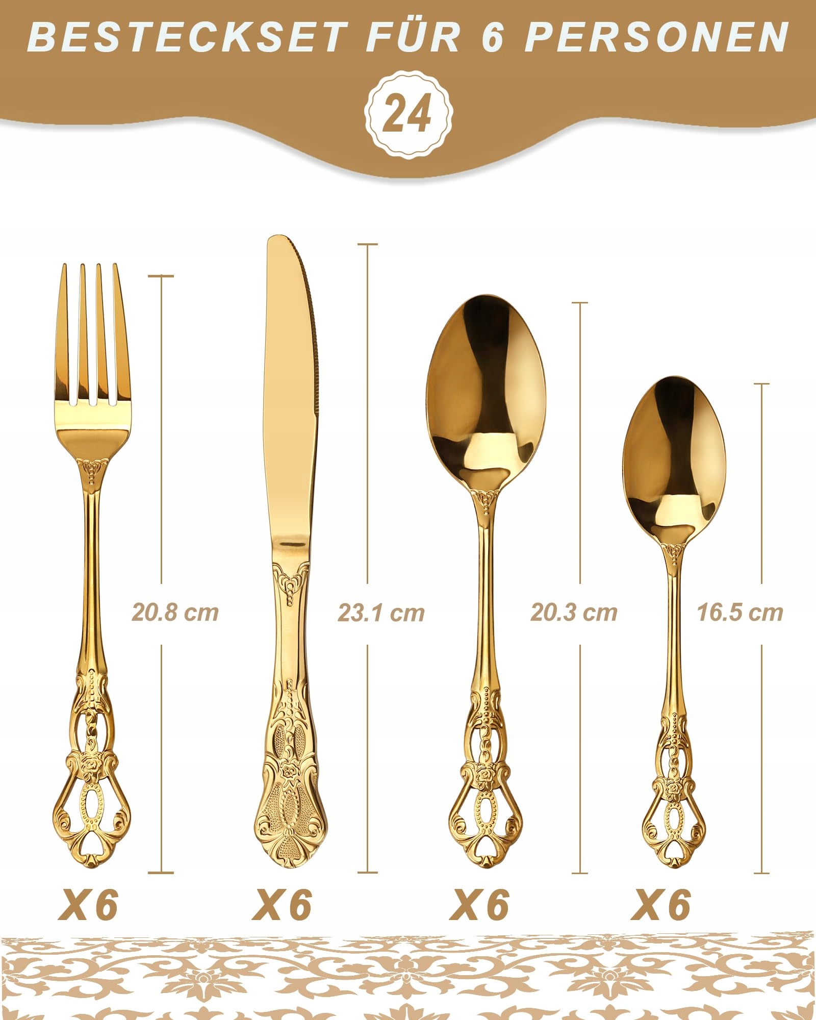 SHEUMNT Retro Zestaw sztućców złotych dla 6 osób, Piękny 24-częściowy zestaw ze stali nierdzewnej, Serwis dla 6 osób, Zestaw przyborów, Widelec, Łyżka, Nóż, antyczny zestaw sztućców barokowych