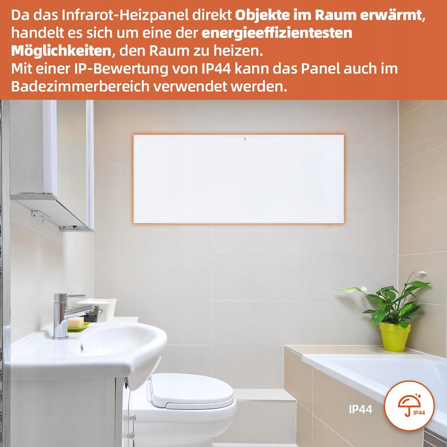 Ponieważ panel grzewczy na podczerwień bezpośrednio ogrzewa obiekty w pomieszczeniu, jest to jedna z najbardziej energooszczędnych metod ogrzewania pomieszczenia. Dzięki ocenie IP44 panel może być również używany w łazience.