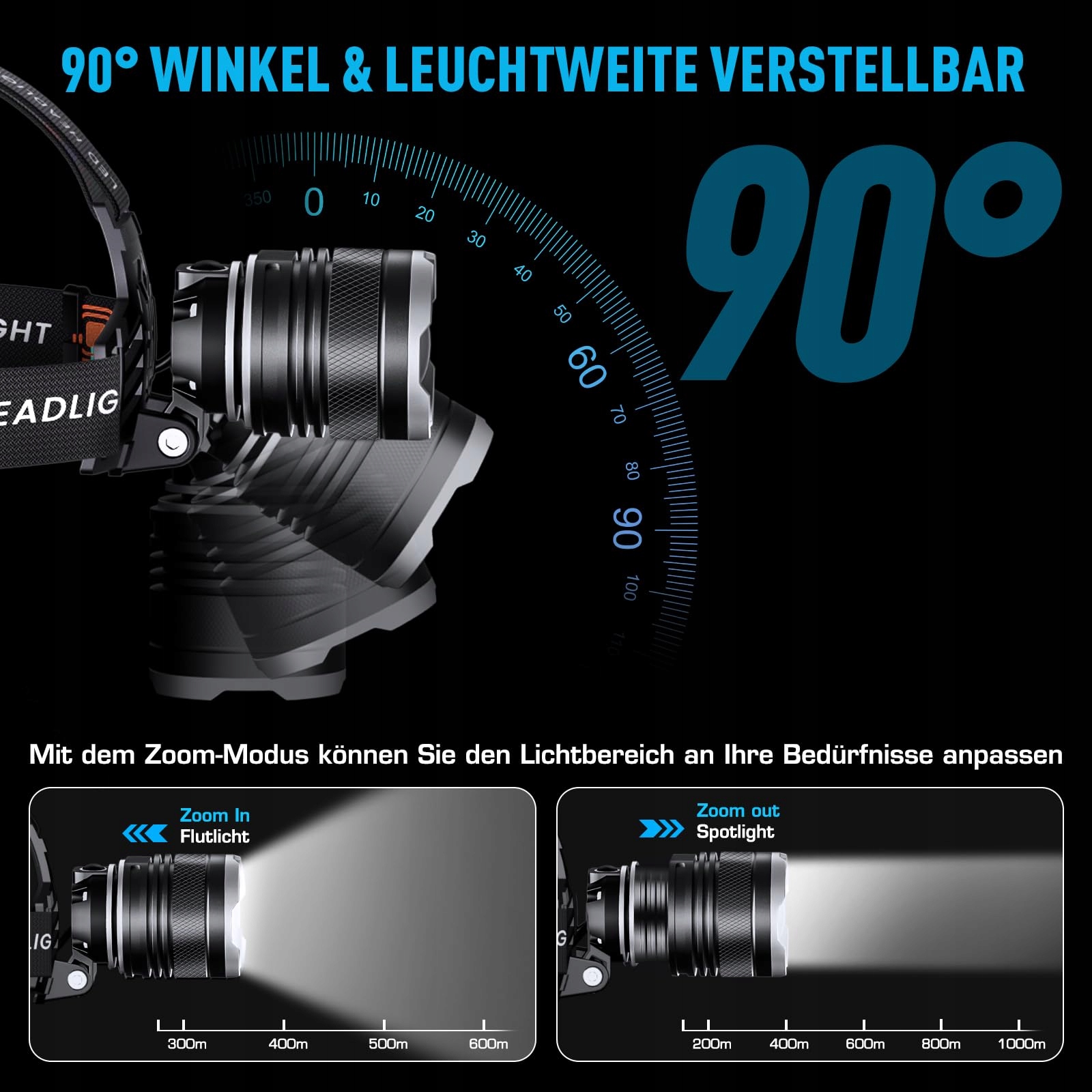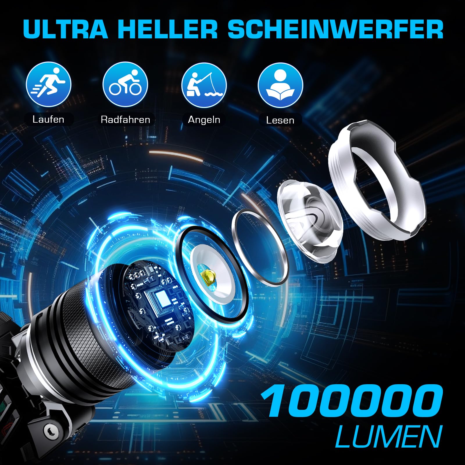 SIDARK Latarka czołowa LED Ładowalna, Superjasna 100000 Lumen Latarka czołowa z 6 trybami świetlnymi i akumulatorem o dużej pojemności 9000mAh oraz wodoodpornością IPX7 i regulacją 90° Latarka czołowa do kempingu na świeżym powietrzu