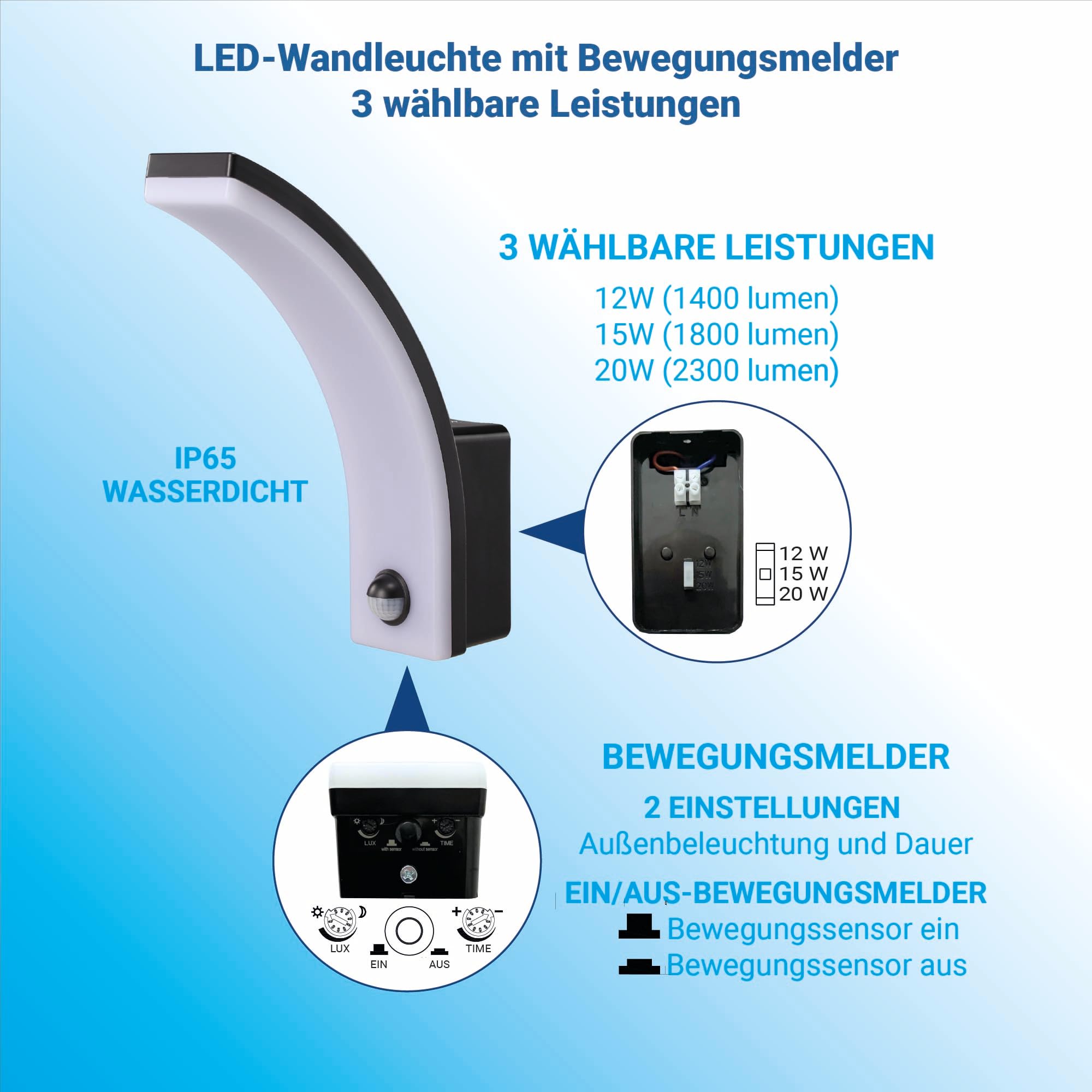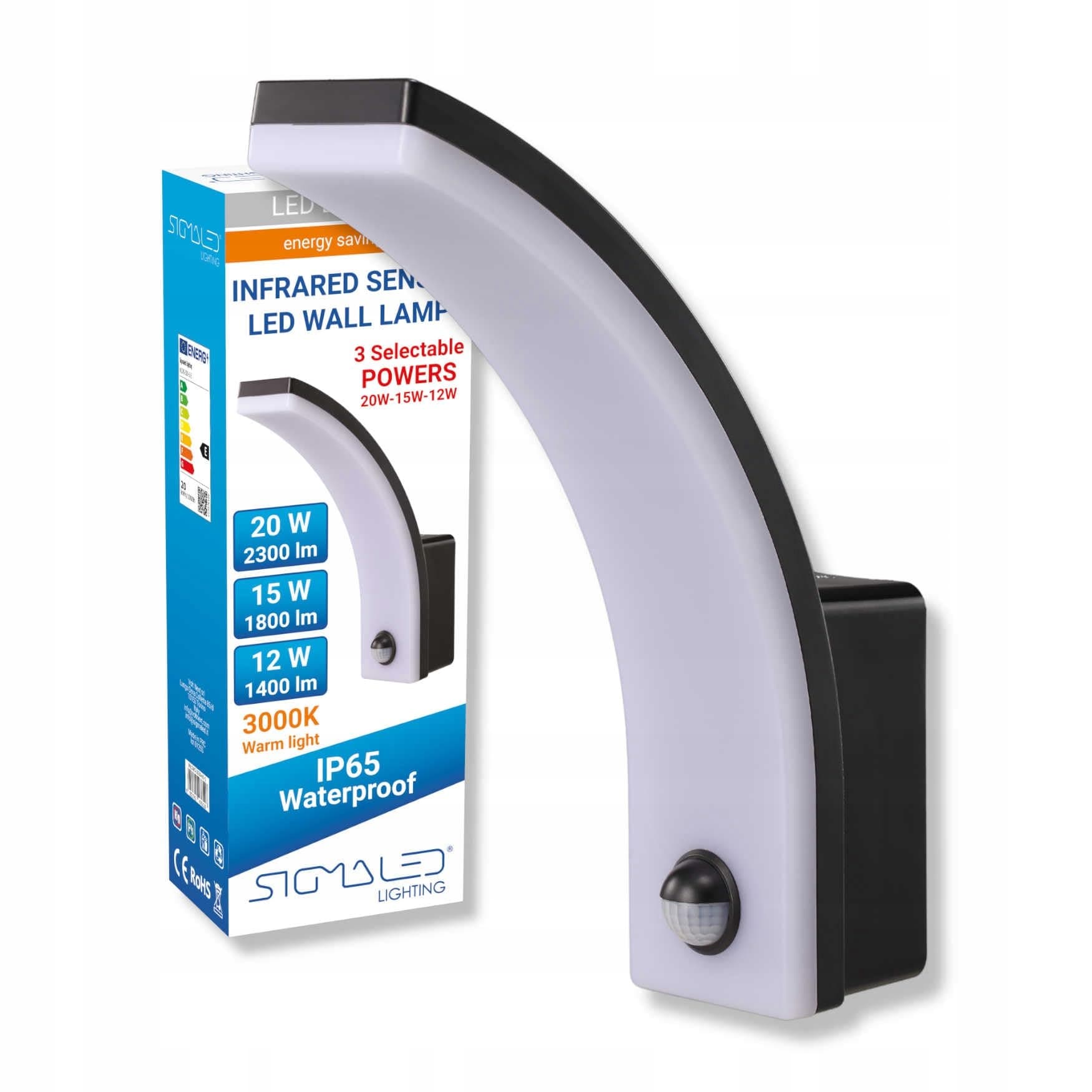 Sigmaled oświetlenie, zewnętrzna lampa ścienna LED z czujnikiem ruchu (możliwość wyłączenia), wodoodporna IP65, 3 wybieralne moce 20W-2300lm 15W-1800lm 12W-1400lm, 3000 K ciepła biel, czarna lampa ścienna na zewnątrz