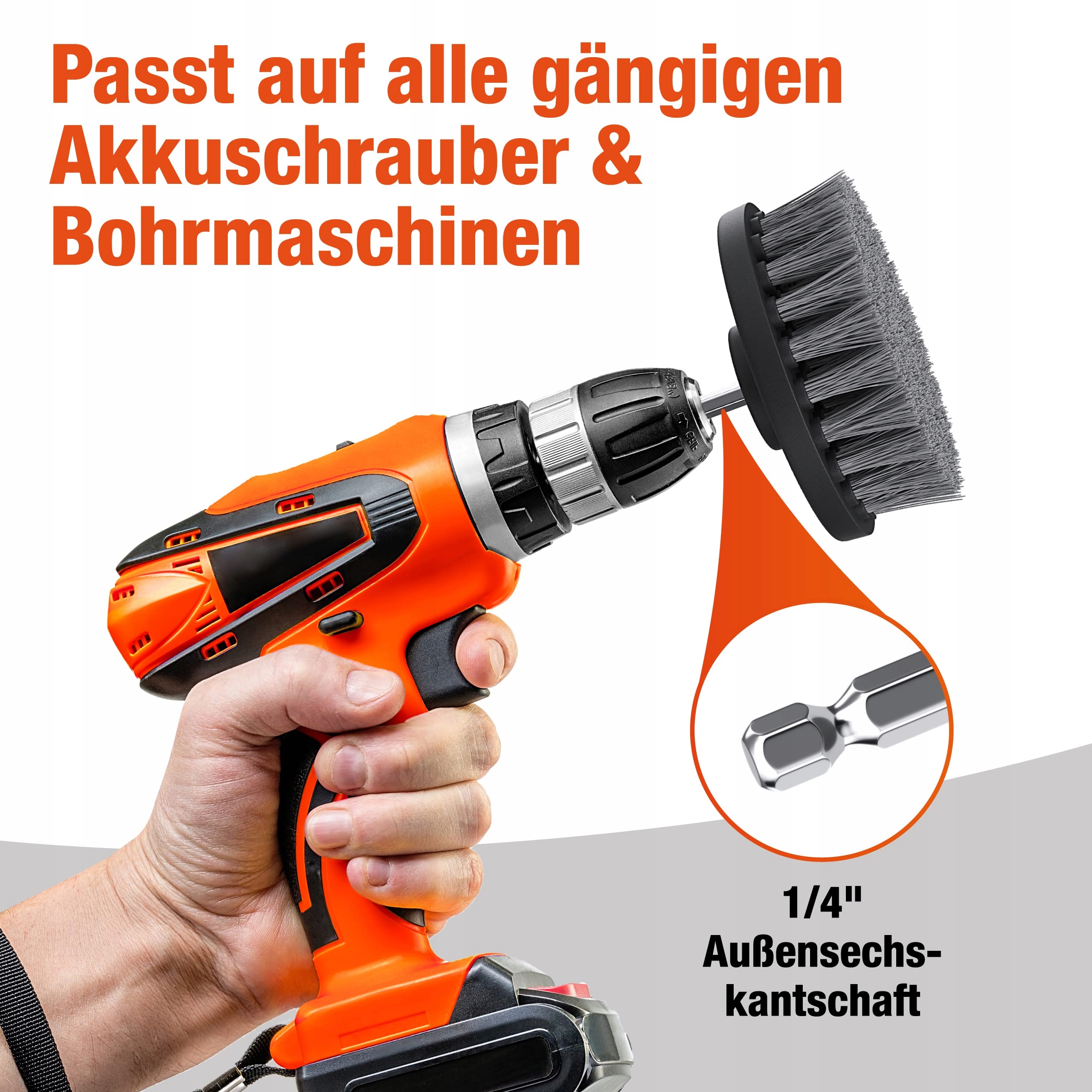 ✔️ NASADKI SZCZOTKOWE PASUJĄ! – Nasadki szczotkowe mają zewnętrzny sześciokąt 1/4" i pasują bez adaptera do wszystkich standardowych wkrętarek akumulatorowych i wiertarek.
