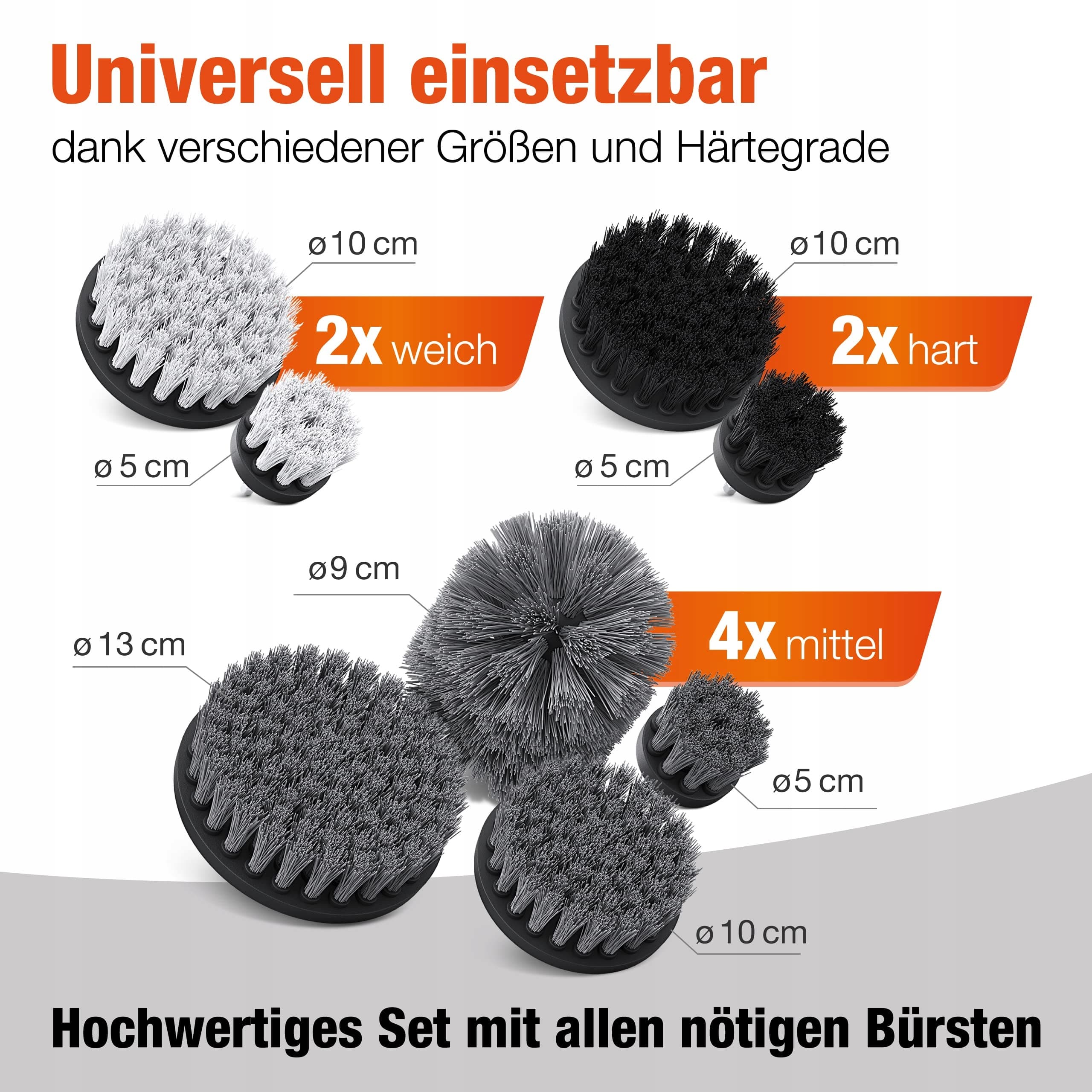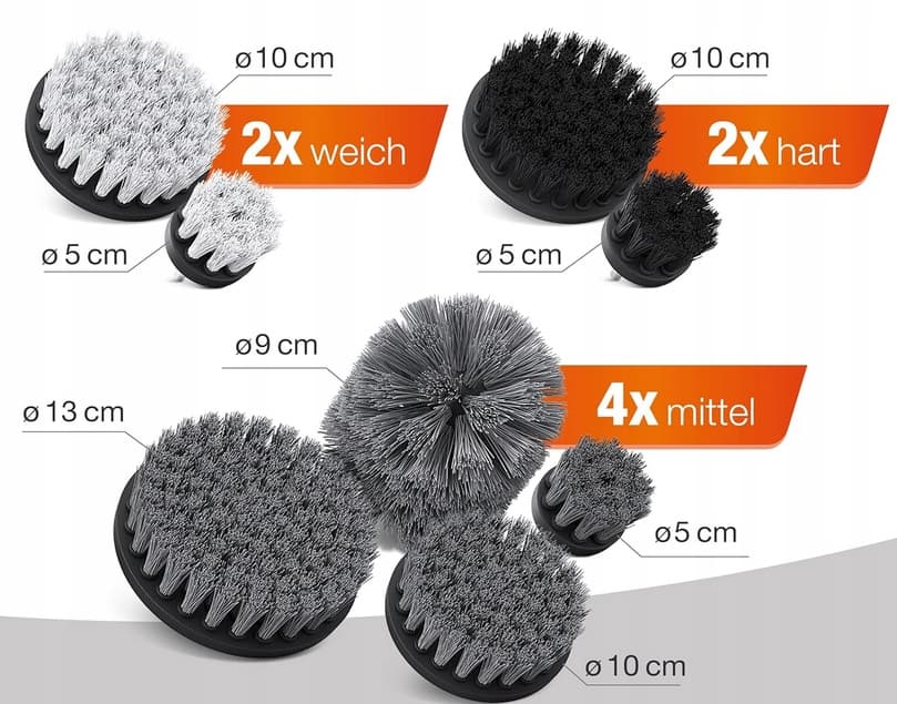 📏 4 ROZMIARY SZCZOTEK – Zestaw zawiera cztery różne rozmiary i kształty szczotek: 3x mała szczotka (Ø 5cm), 3x średnia szczotka (Ø 10cm), 1x duża szczotka (Ø 13cm), 1x szczotka okrągła (Ø 9cm)