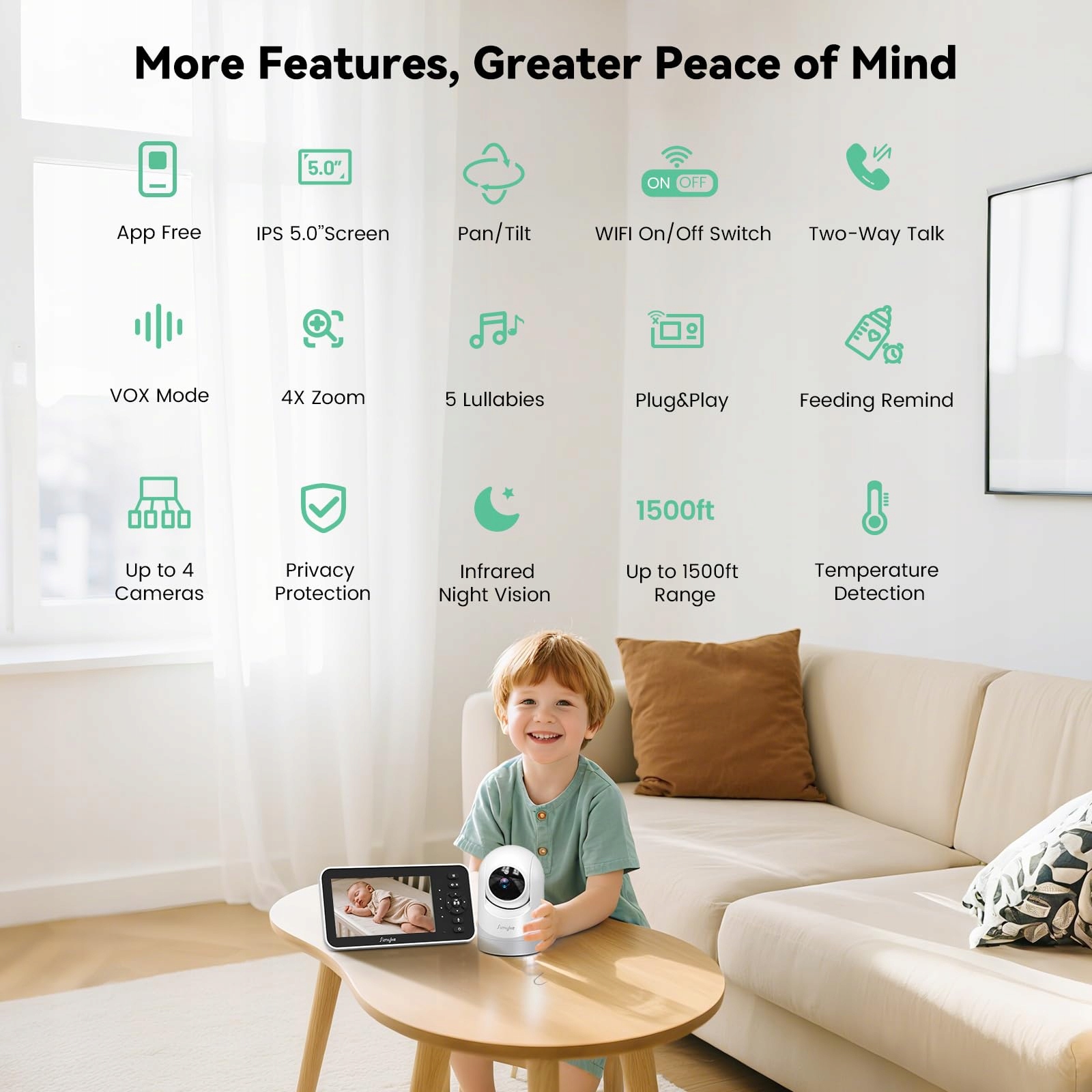 Video-niania BME50P obsługuje 5-calowy wyświetlacz IPS bez Wi-Fi ani połączenia przez 2,4 GHz WiFi z darmową aplikacją Simyke, wspiera iOS i Android. Idealna dla świeżo upieczonych rodziców, którzy szukają połączenia nowoczesnej technologii, niezawodności i spokoju ducha.