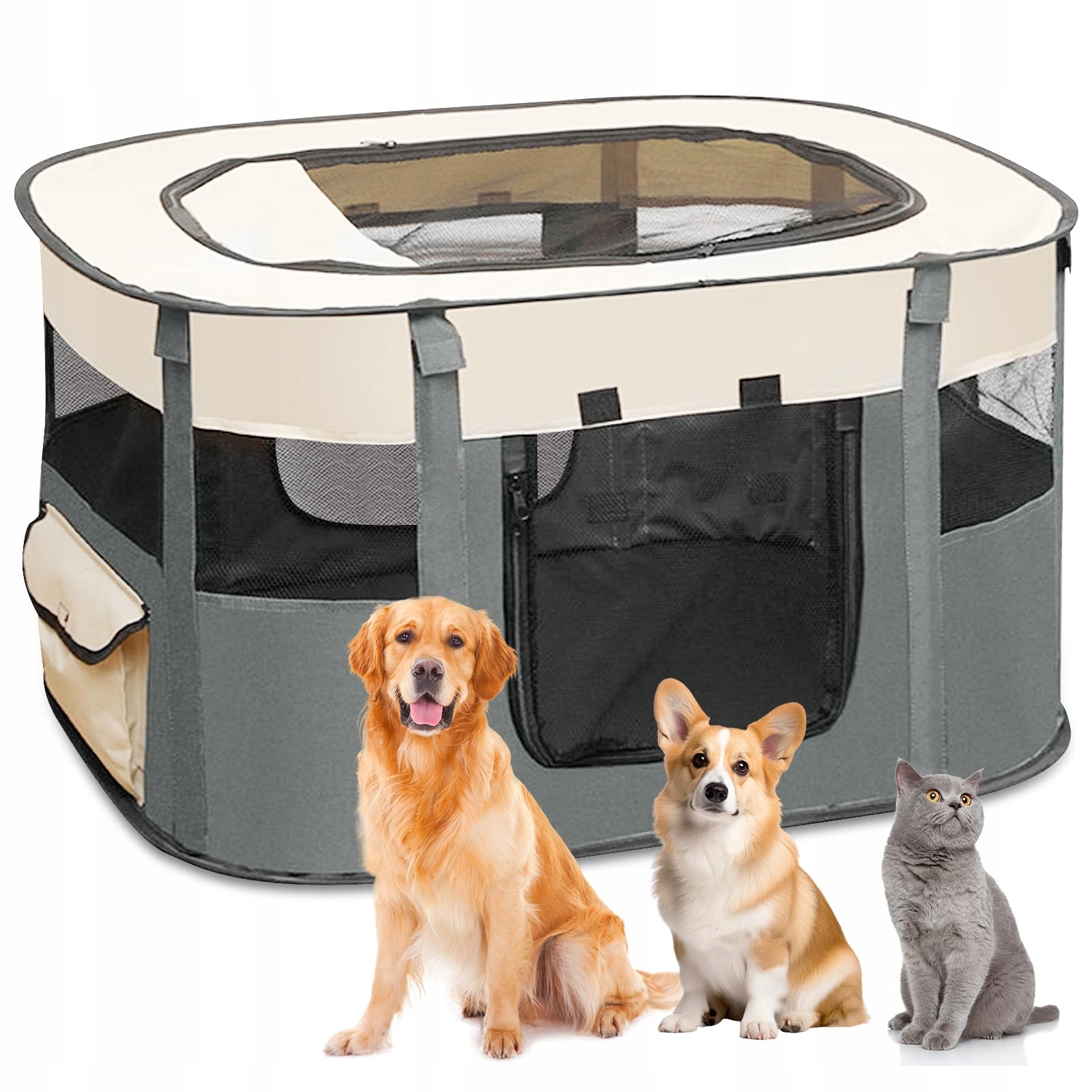 [Składany design] Składany design ogrodzenia dla zwierząt ułatwia przechowywanie i transport, nadaje się do użytku wewnątrz i na zewnątrz. Zasłona drzwi jest wyposażona w zamki błyskawiczne i rzepy, które można łatwo zwinąć i przymocować; Po bokach znajdują się kieszenie na małe przedmioty potrzebne zwierzętom.