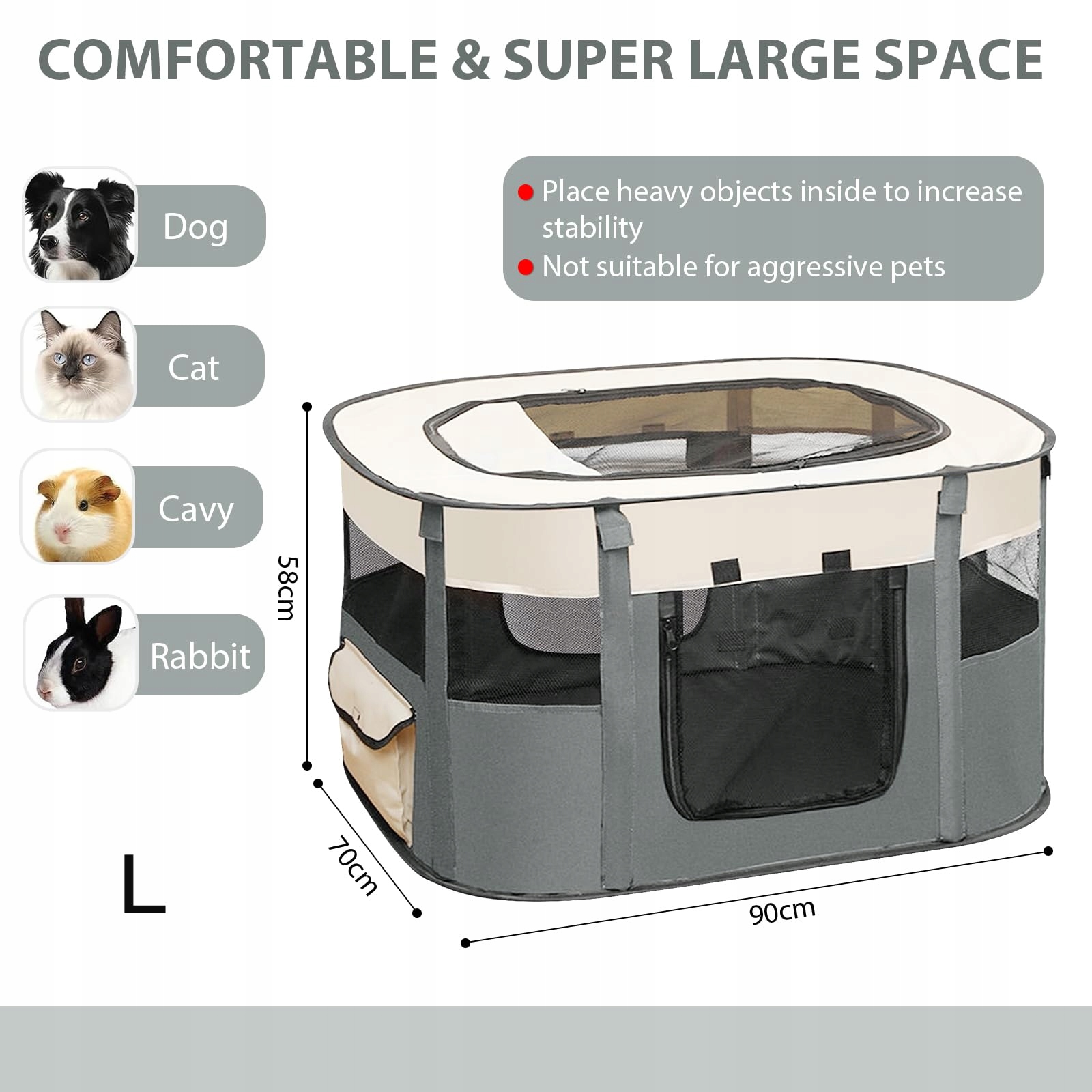 [Prostokątne ogrodzenie dla zwierząt] Rozmiar szarego kojca dla szczeniąt (L) wynosi 90 x 70 x 58 cm, co tworzy ciepły dom dla zwierząt. Nasze kojce dla szczeniąt do wnętrz są dostępne w 7 kolorach: Szary/Brązowy/Fioletowy/Żółty/Różowy/Kratka Zielona/Ciemnozielony, każdy kolor jest dostępny w 4 rozmiarach: S/M/L/XL, ogrodzenie dla zwierząt jest idealne dla Twoich futrzanych przyjaciół, zapewniając im wystarczającą przestrzeń do zabawy. Proszę wybrać odpowiedni dom dla zwierząt w zależności od rozmiaru Twojego futrzanego przyjaciela.