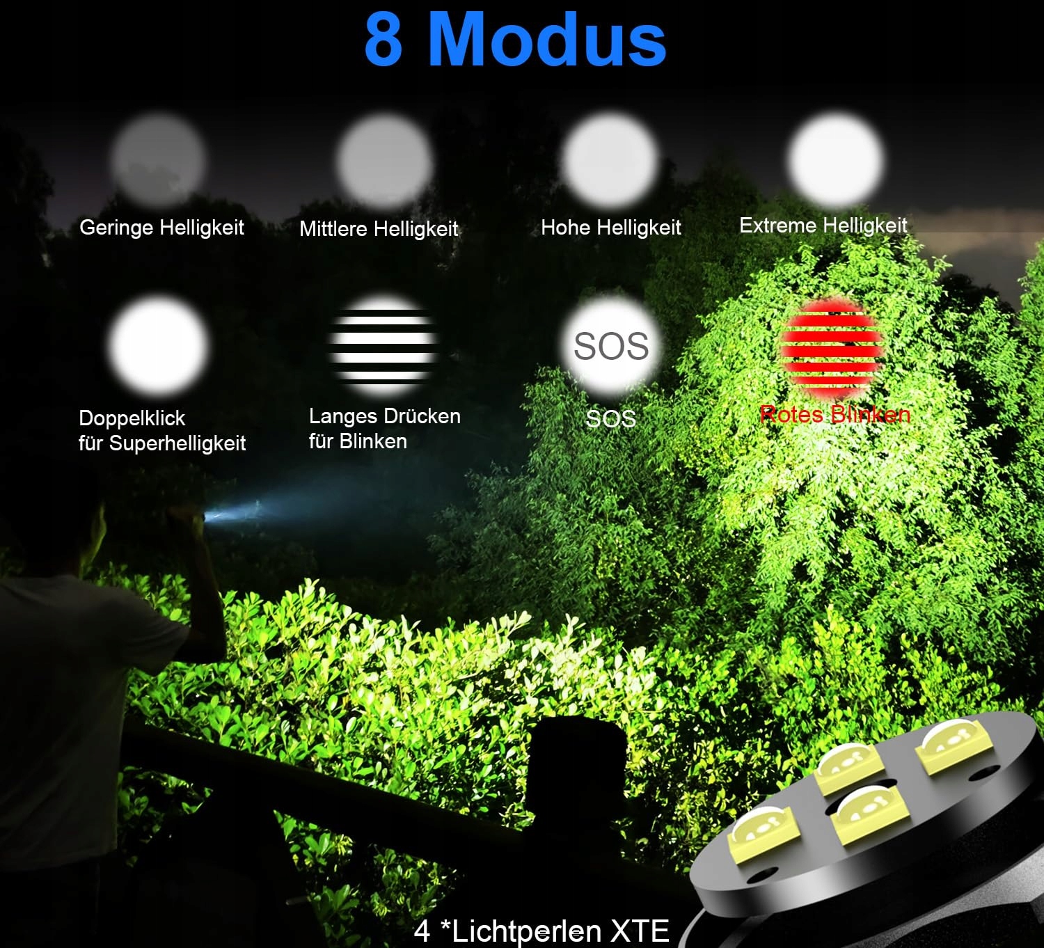 [Superjasna latarka LED]Z jasnością sięgającą 6000 lumenów i zasięgiem do 400 metrów, nasza wysoko intensywna latarka LED może oświetlić Twoje sytuacje na zewnątrz i w sytuacjach awaryjnych. Ta latarka została zaprojektowana z myślą o niskim zużyciu energii i oferuje jasne, szerokie oświetlenie, idealne na nocne spacery, biwakowanie, wędrówki lub podczas przerwy w dostawie prądu.
