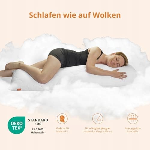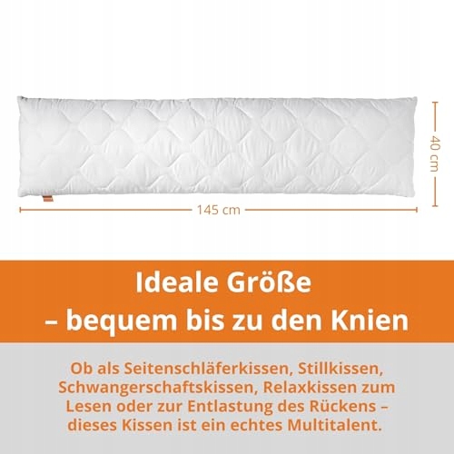 ZASTOSOWANIE: Poduszka ma długość 145 cm i jest optymalnie odpowiednia jako poduszka do spania na boku, poduszka do karmienia, poduszka ciała, poduszka ciążowa, bodypillow lub klasyczna poduszka pod nogi. Do użytku w łóżku lub na kanapie i sofie