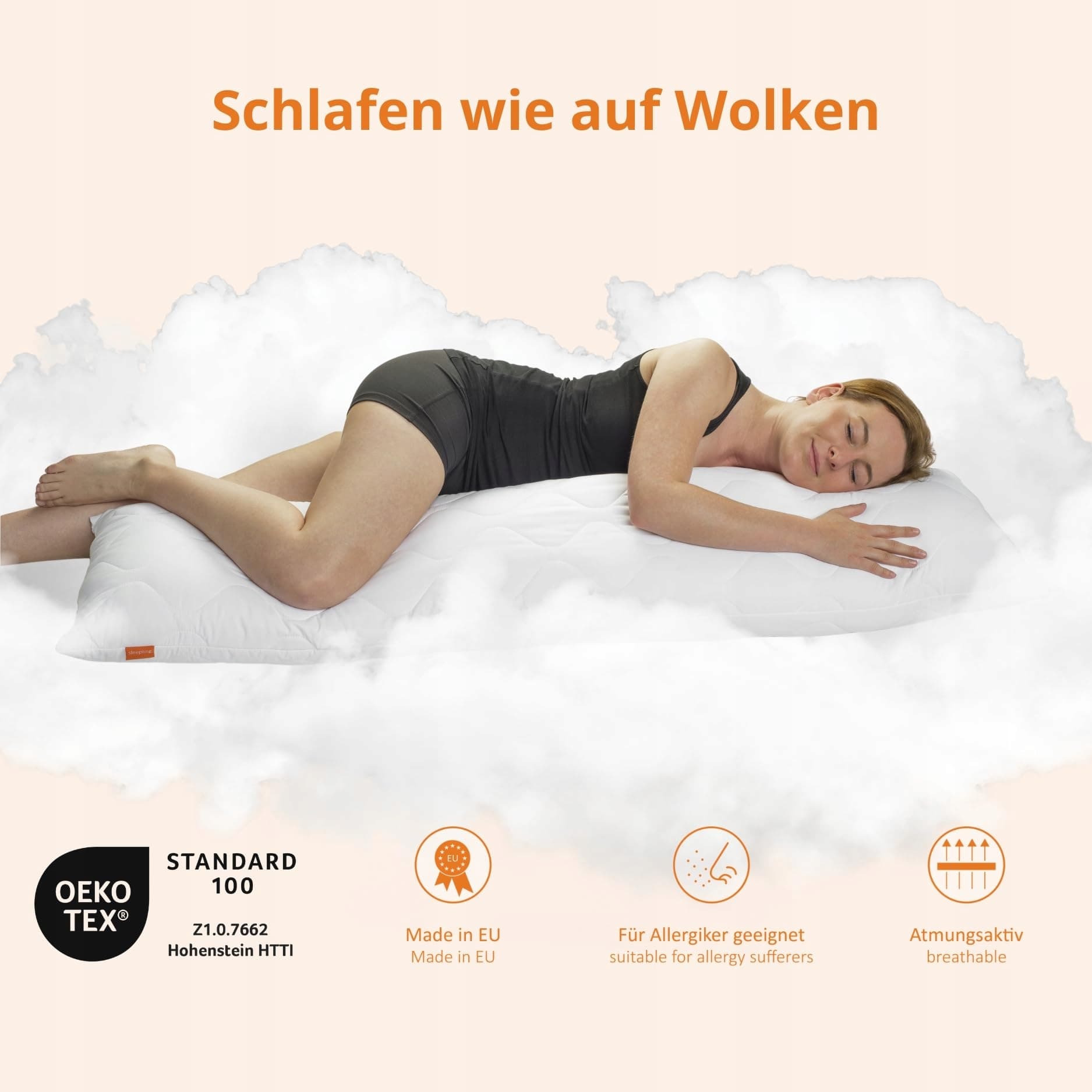WYPEŁNIENIE: 100% poliester (włókno klimatyczne) zgodnie ze standardem Öko-Tex 100 (1200 g wypełnienia). Poduszka jest indywidualnie regulowana za pomocą zamka błyskawicznego – dodatkowe wypełnienie dostępne bezpłatnie na życzenie w naszym zespole obsługi