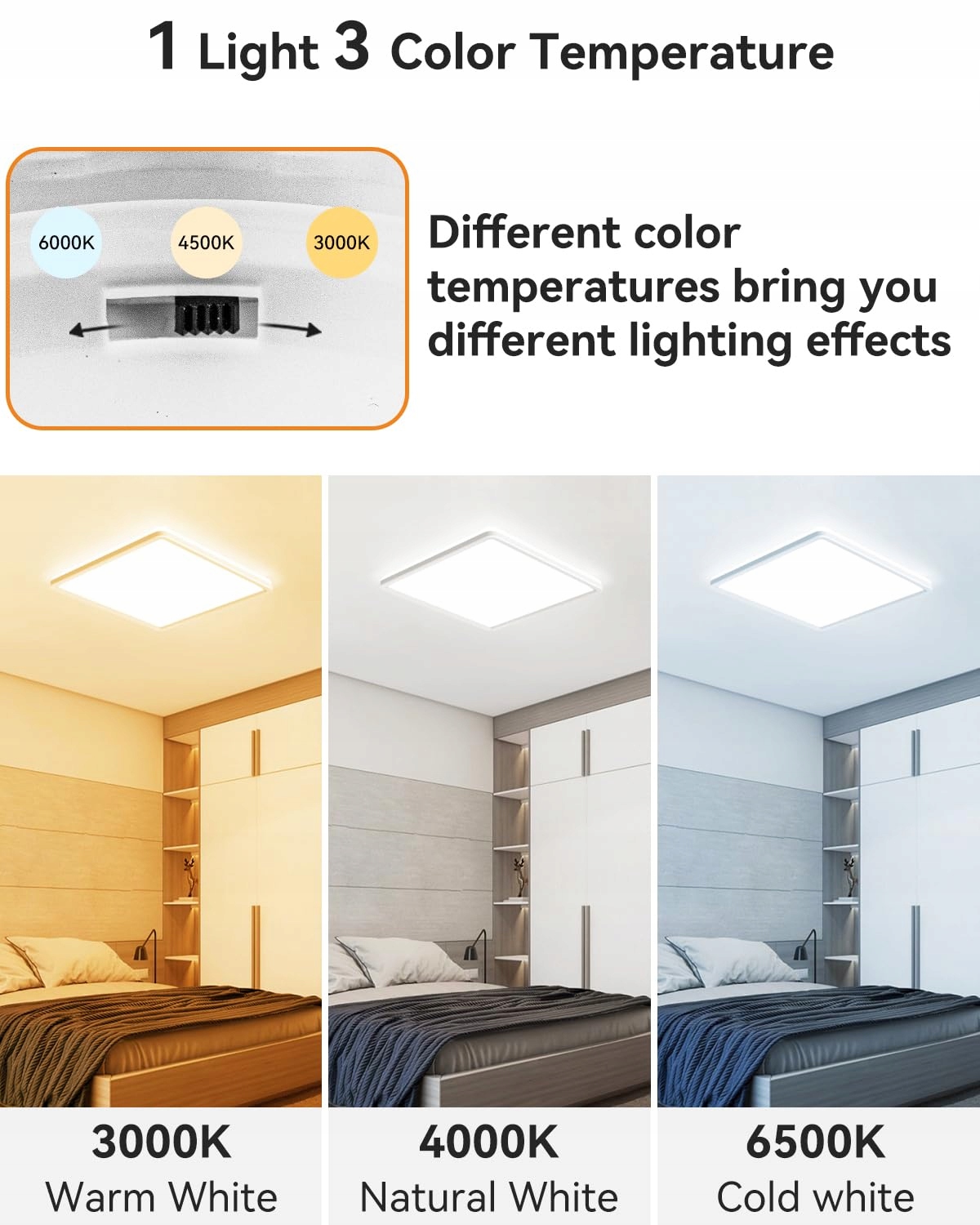 Łatwy montaż: Metoda montażu tej lampy LED jest prosta, uchwyt montażowy do przesuwania i blokowania umożliwia łatwą i bezpieczną instalację. Kilka minut i 3 kroki: najpierw przymocuj uchwyt montażowy, następnie wpiąć przewody, po trzecie, wsunąć światło i zablokować, a potem gotowe. Będzie to również bardzo wygodne dla jednej osoby, aby niezależnie zainstalować lampę sufitową z dołączonymi akcesoriami. [Ciepłe wskazówki] tylko z normalnymi przełącznikami ON/OFF na ścianie