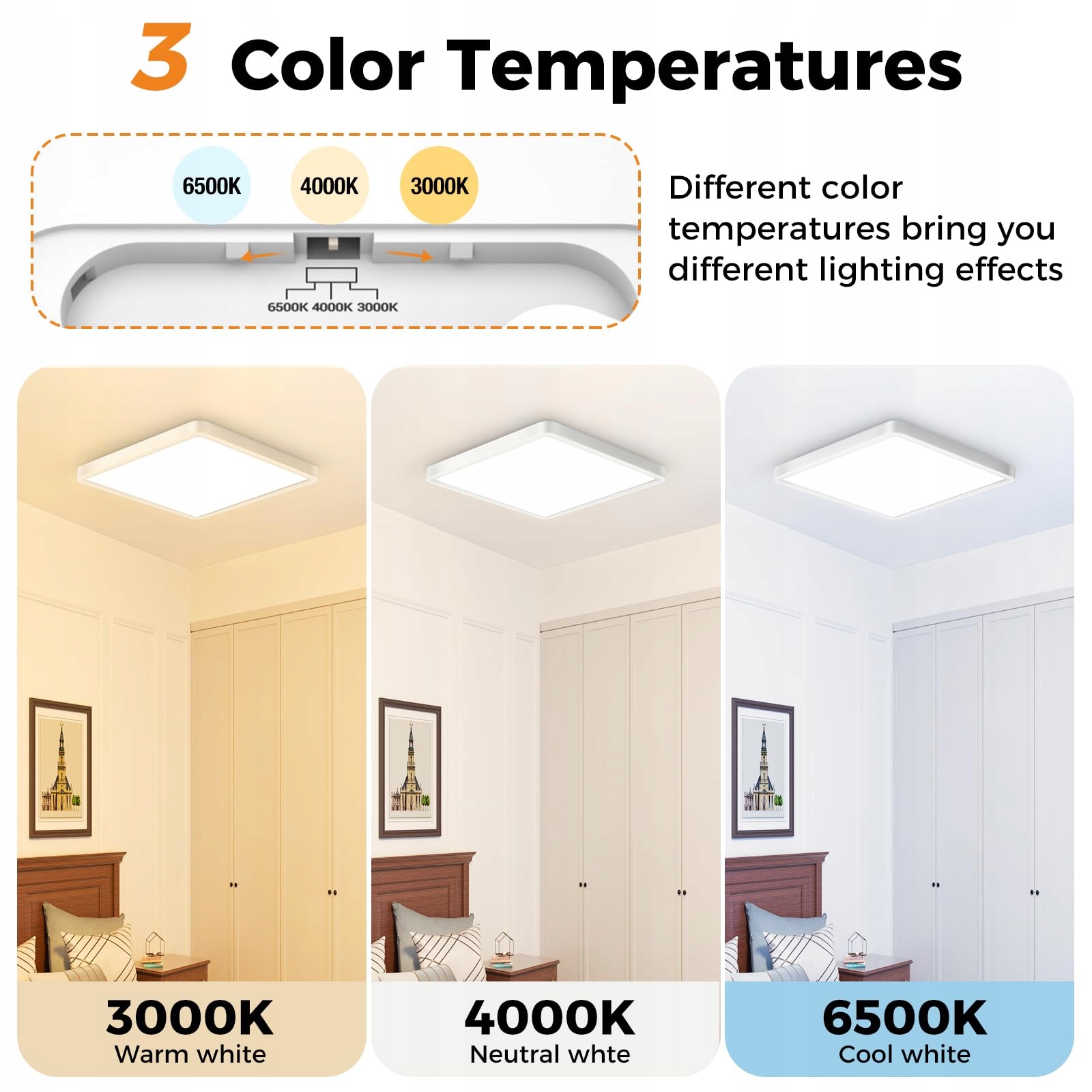 3-w-1 lampa sufitowa: Ta lampa sufitowa LED ma funkcję wyboru temperatury barwowej. Dzięki opcjonalnemu przełącznikowi kolorów, który udostępniamy, możesz ustawić swoją preferowaną temperaturę barwową (3000K ciepła biel/4000K naturalna biel/6500K biel dzienna). Lampa sufitowa slochi do łazienki jest wykonana z wysokiej jakości chipów LED, o jasności do 1500LM, co zapewnia jasne, wysokiej jakości światło w Twoim pomieszczeniu