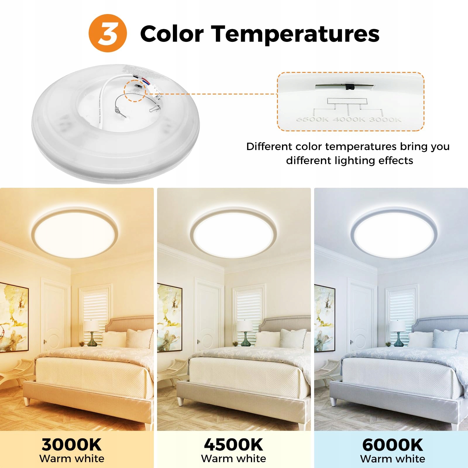 3 temperatury barwowe: 3000K ciepła biel, 4000K neutralna biel, 6500K biel dzienna. Imprezy domowe potrzebują ciepłego światła, życie potrzebuje przyjemnego światła, praca i nauka potrzebują jaśniejszego światła. 3 różne temperatury barwowe dla różnych potrzeb oświetleniowych