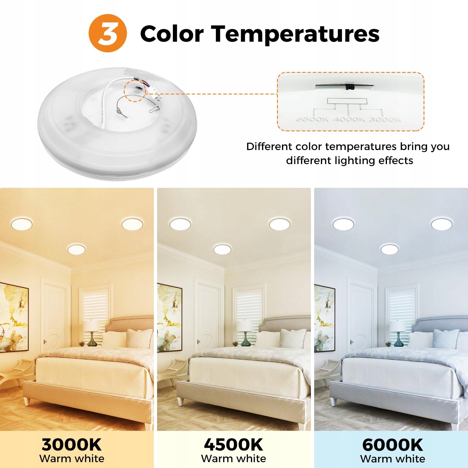 3 temperatury barwowe: 3000K Ciepła biel, 4000K Neutralna biel, 6500K Dzienna biel. Ustaw preferowaną temperaturę barwową, naciskając przycisk z tyłu lampy sufitowej do łazienki. Imprezy potrzebują ciepłego światła, życie potrzebuje przyjemnego światła, a praca potrzebuje jaśniejszego światła. 3 różne temperatury barwowe spełniają Twoje różne potrzeby oświetleniowe