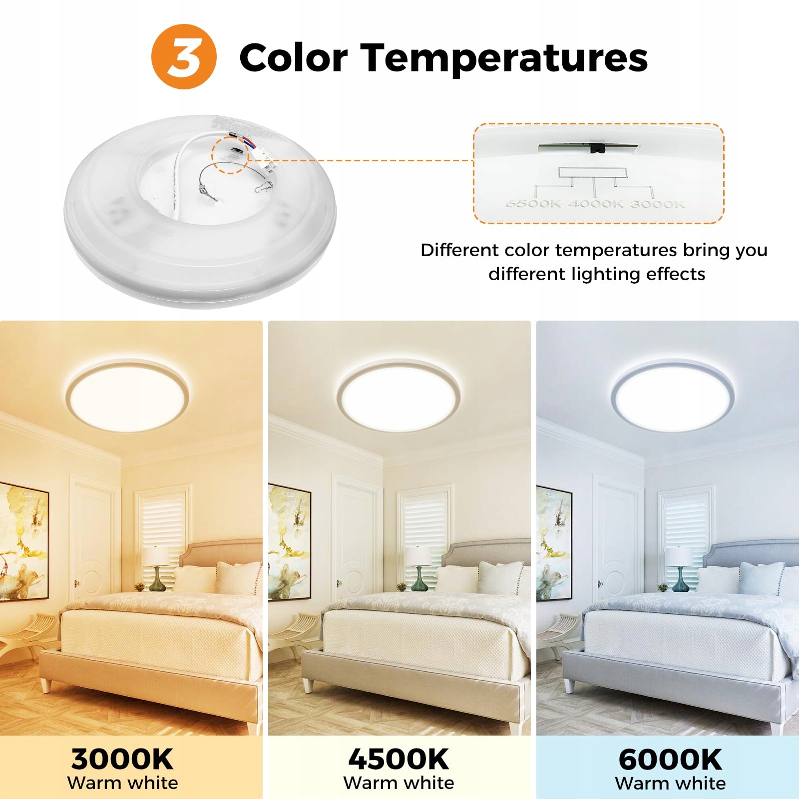 3 temperatury barwowe: 3000K ciepła biel, 4000K neutralna biel, 6500K biel dzienna. Ustaw preferowaną temperaturę barwową, naciskając przycisk z tyłu lampy sufitowej do łazienki. Imprezy potrzebują ciepłego światła, życie potrzebuje przyjemnego światła, a praca potrzebuje jaśniejszego światła. 3 różne temperatury barwowe spełniają Twoje różne potrzeby oświetleniowe