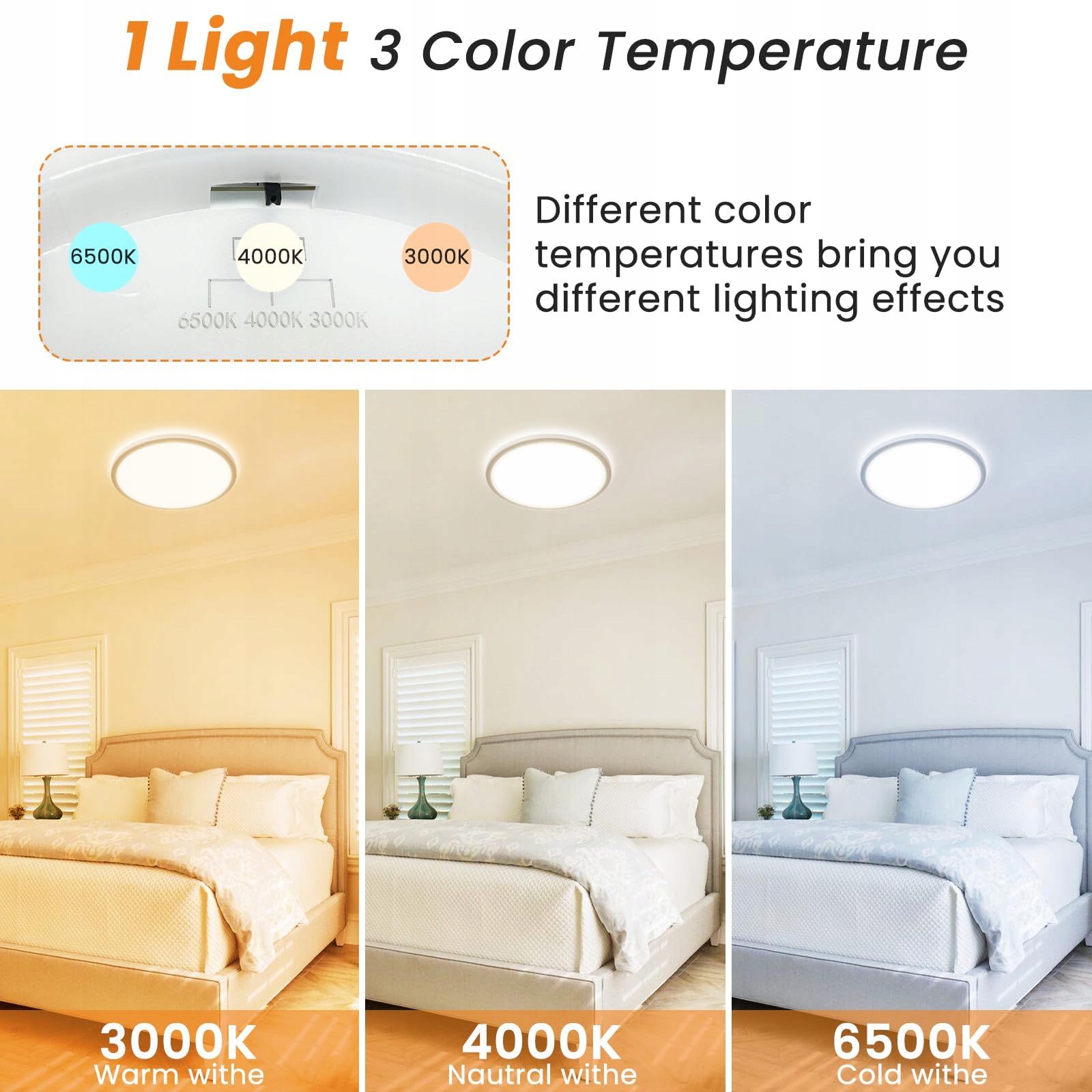 Łatwa instalacja i ultra cienka: Przymocuj podstawę za pomocą śrub, podłącz przewody i przykręć lampę sufitową do podstawy. Instalacja jest prosta, bezproblemowa i nie zajmuje dużo czasu. 22 * 2,8 cm, ultra cienki wygląd jest bardziej zwięzły i elegancki, nie zajmuje miejsca i sprawia, że pomieszczenie jest cieplejsze