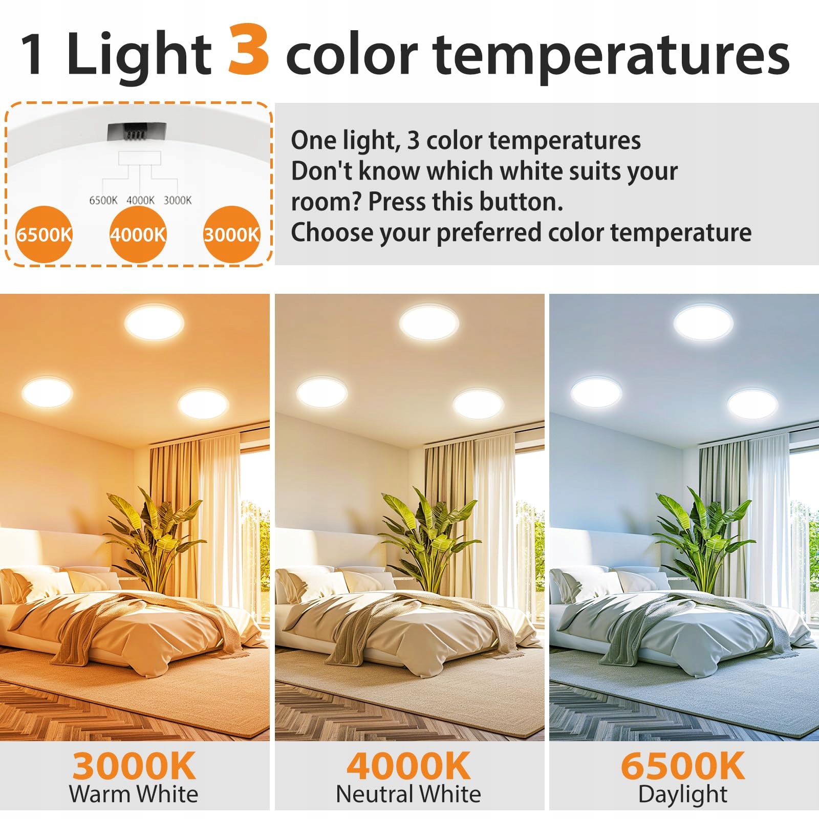 【3 kolory do wyboru】 Lampa sufitowa Slochi została wyposażona w 3 kolory (Ciepła biel 3000K, Naturalna biel 4000K, Biel dzienna 6500K). Ustaw temperaturę barwową za pomocą przycisku z tyłu lampy. Wybierz ciepłe światło jako lampkę nocną, która jest wygodna do wstawania w nocy; zimne światło do pokoju dziecięcego, biura domowego oraz do pracy i nauki