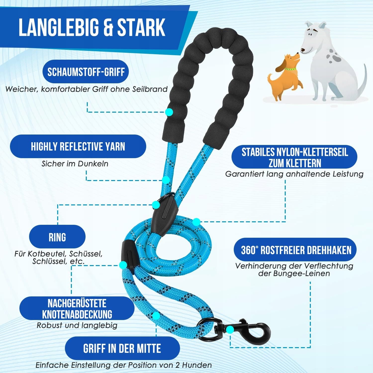Odblaskowe paski --- Zarówno na pojedynczej smyczy bungee, jak i na głównej linie naszej podwójnej smyczy dla psów umieściliśmy odblaskowe paski. Te paski zapewniają, że Ty i Twoje zwierzęta jesteście dobrze widoczni podczas nocnych spacerów, oferując dodatkowe bezpieczeństwo. Dzięki naszej smyczy dla 2 psów możesz cieszyć się spacerami z Twoimi futrzanymi przyjaciółmi zarówno w dzień, jak i w nocy.