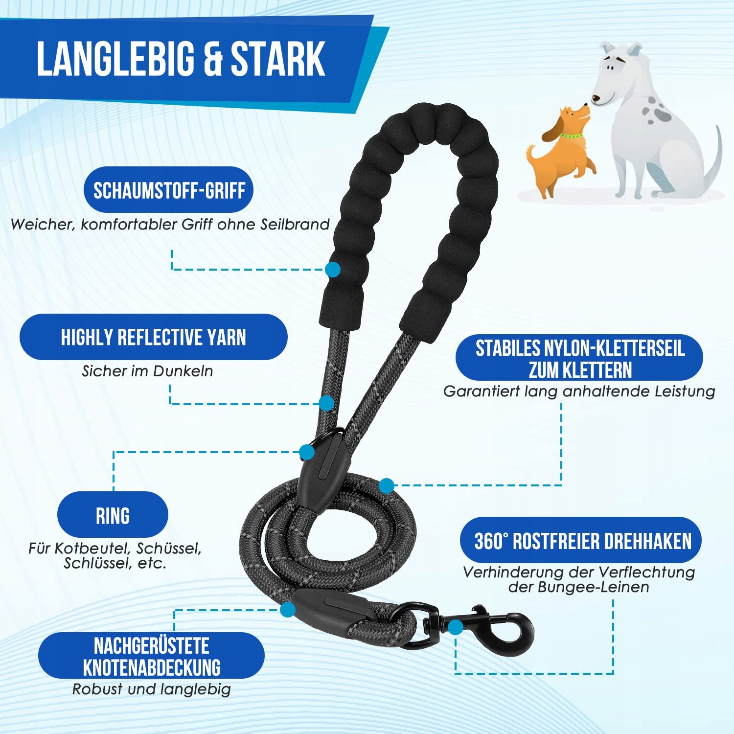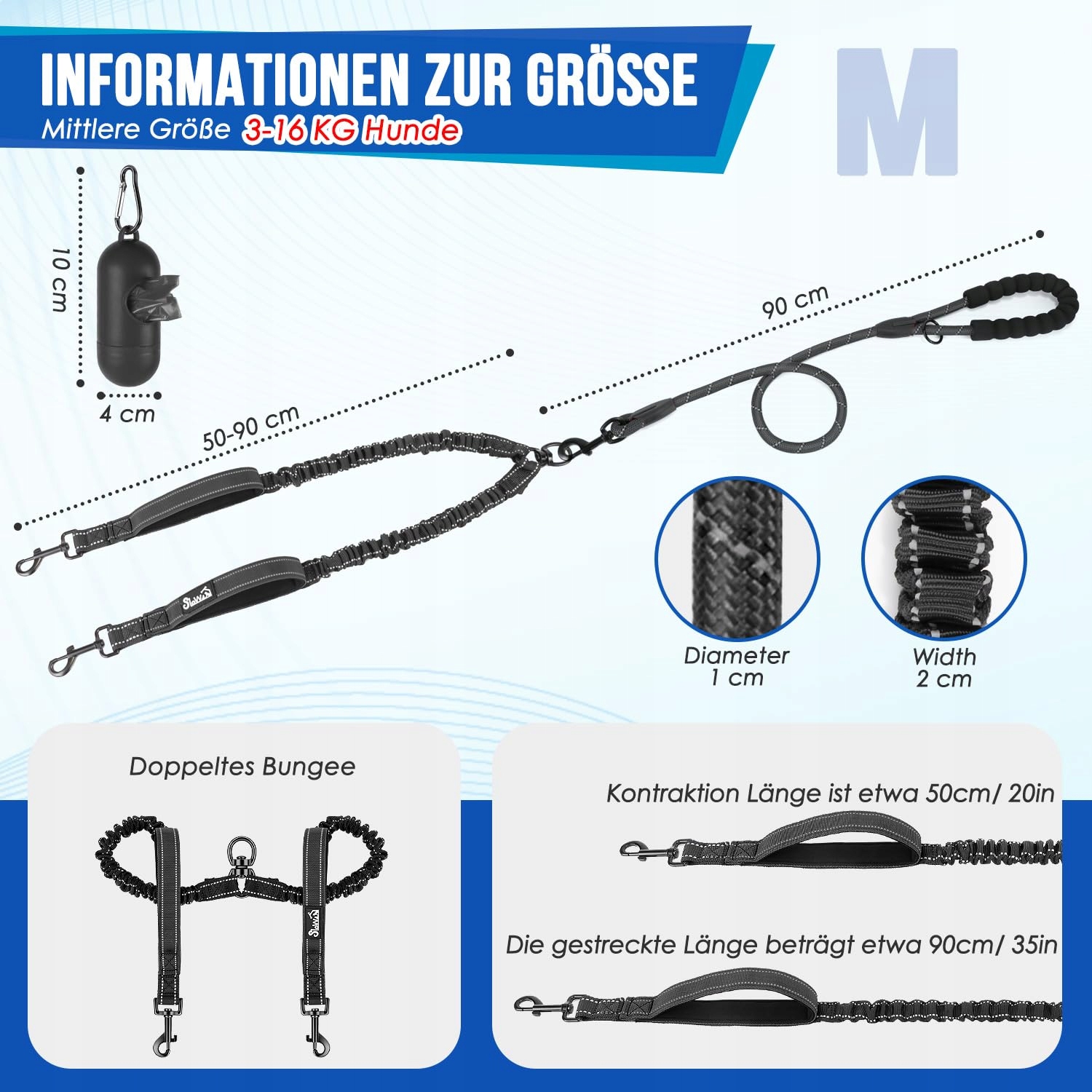 Odblaskowe paski --- Zarówno na pojedynczej smyczy Bungee, jak i na głównej smyczy naszej podwójnej smyczy dla psów umieściliśmy odblaskowe paski. Te paski zapewniają, że Ty i Twoje zwierzęta jesteście dobrze widoczni podczas nocnych spacerów, oferując dodatkowe bezpieczeństwo. Z naszą smyczą dla 2 psów możesz cieszyć się spacerami z Twoimi futrzanymi przyjaciółmi zarówno w dzień, jak i w nocy.