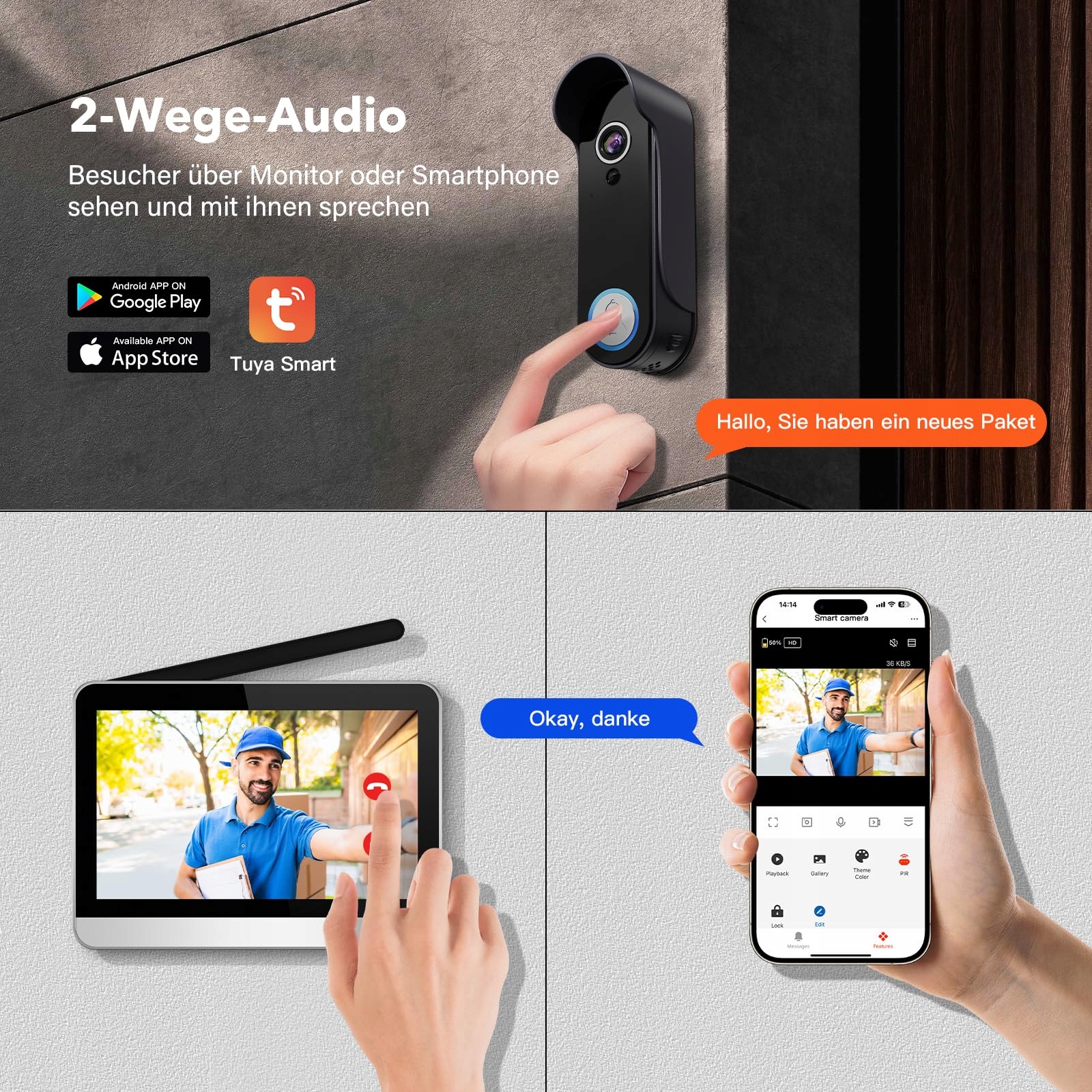 [Bezprzewodowy, łatwy montaż]: Nie są potrzebne żadne kable. Kamera dzwonka do drzwi i ekran są połączone przez wbudowany pasmo stałej częstotliwości, które przenika około dwóch ścian (z wyjątkiem ścian nośnych). Kompatybilny z aplikacją Tuya do zdalnego sterowania smartfonem, do wspólnego użytku z rodziną dla mobilnej kontroli.
