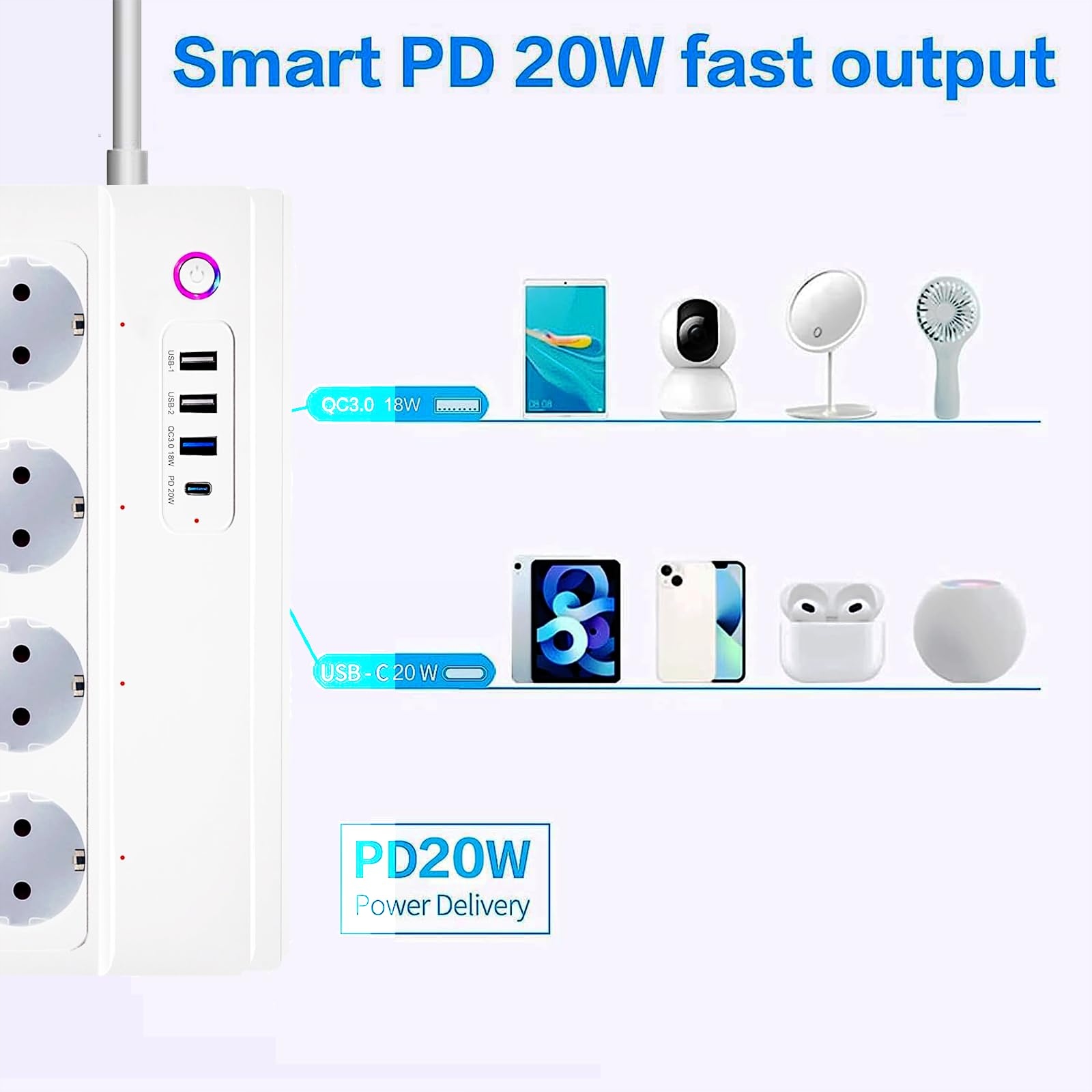 SMART WLAN Listwa USB C 20W, 4 Gniazda, Alexa/Google Control | Premium Supply