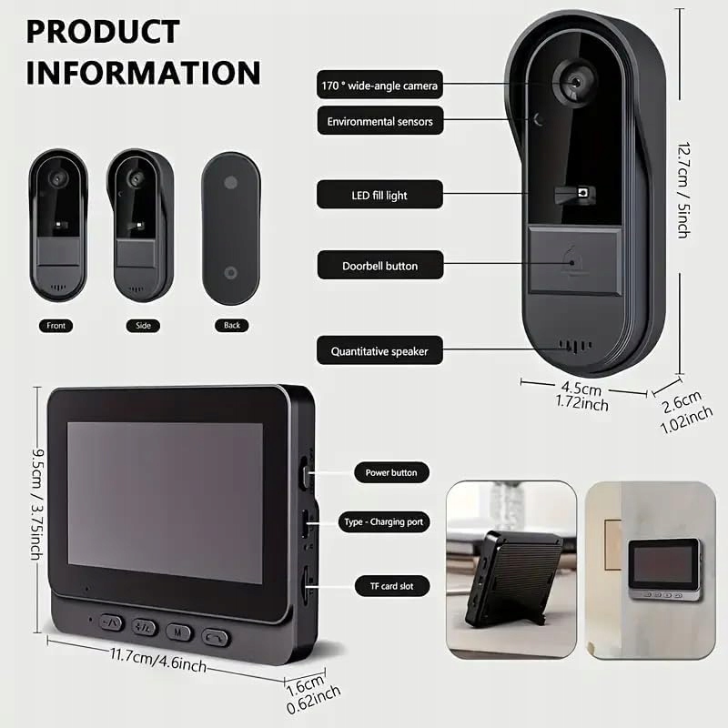 【Automatyczne zdjęcia i nagrywanie】: Dzięki wbudowanej pamięci oraz zewnętrznej pamięci na karcie TF (karta TF nie jest dołączona) bezprzewodowa kamera dzwonka umożliwia łatwy dostęp do twoich filmów i zdjęć. 【Funkcja zdjęć i wideo】 Po naciśnięciu dzwonka (nagrywanie wideo jest aktywowane tylko z kartą TF) możesz skonfigurować automatyczne nagrywanie i robienie zdjęć. Monitor wewnętrzny automatycznie robi zdjęcie i rozpoczyna nagrywanie. System może przechowywać zdjęcia, nadpisywać pętle i zapisywać najnowsze zdjęcia oraz filmy.