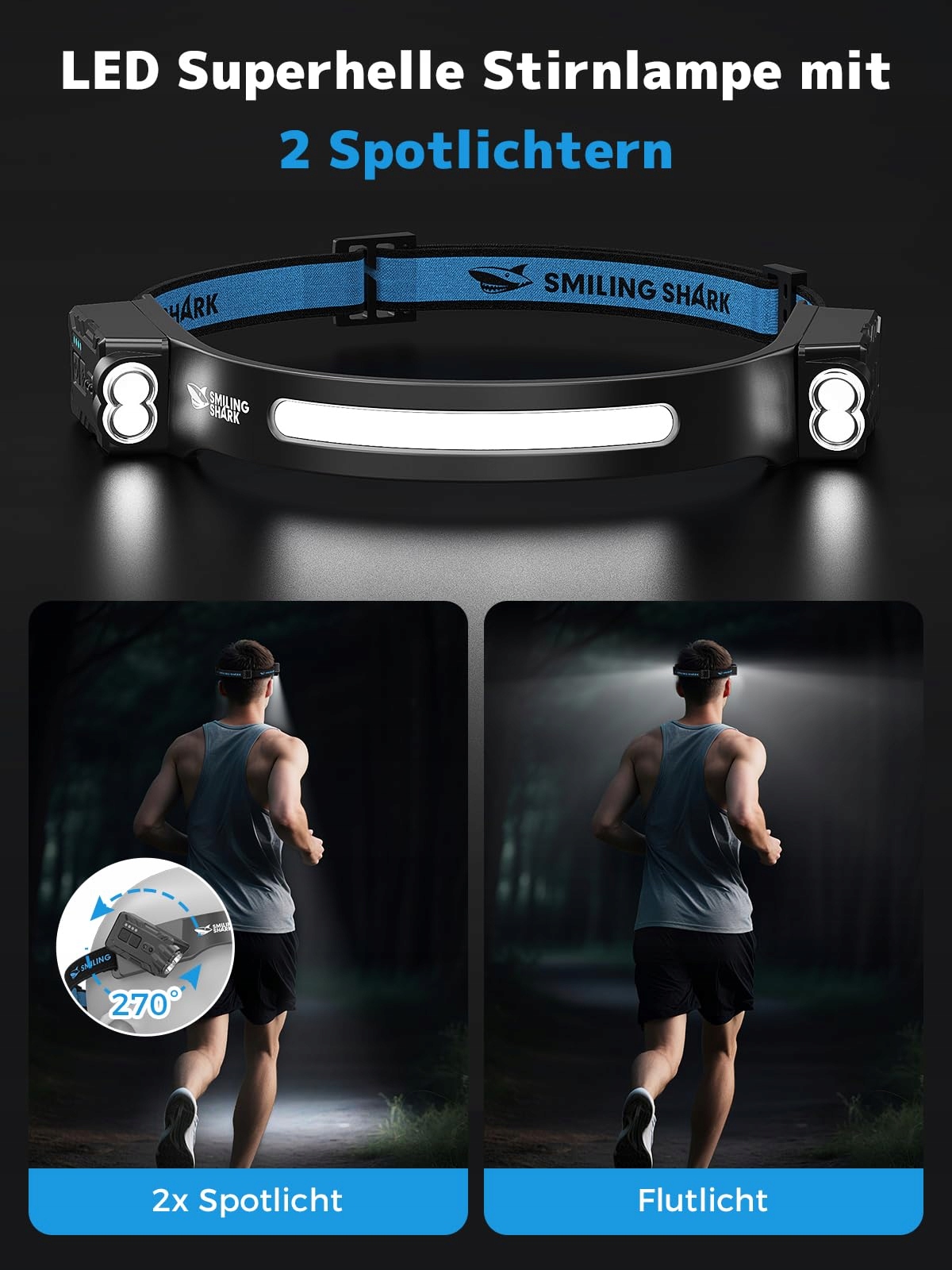 Smiling Shark Latarka czołowa, 2400mAh Ultra jasna, wielokrotnego ładowania Latarka czołowa Białe światło & 2*reflektory z czujnikiem ruchu Multi-tryb LED z funkcją obrotu 270° do outdoor, camping, wędrówek