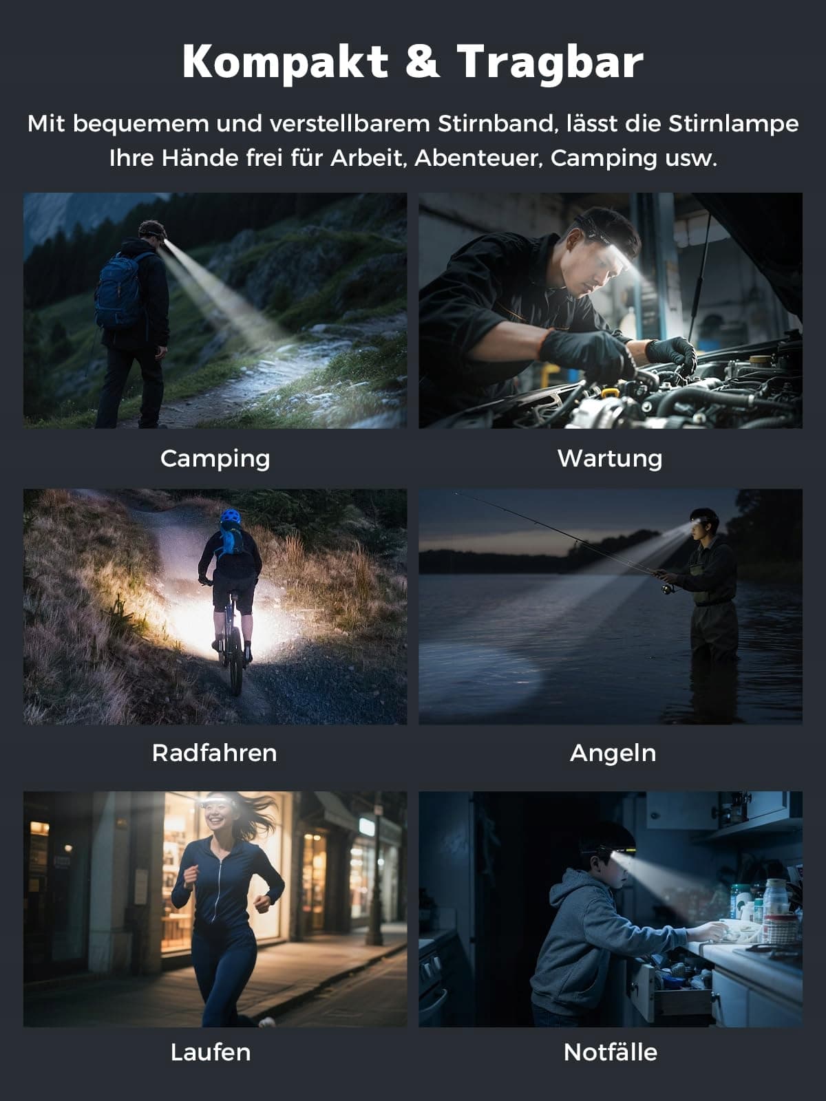 【Idealna na nocne aktywności】 Niezależnie czy biwakujesz, wędrujesz, łowisz ryby czy wykonujesz prace domowe, latarka czołowa zapewnia idealną ilość światła do wszystkich Twoich nocnych zajęć.