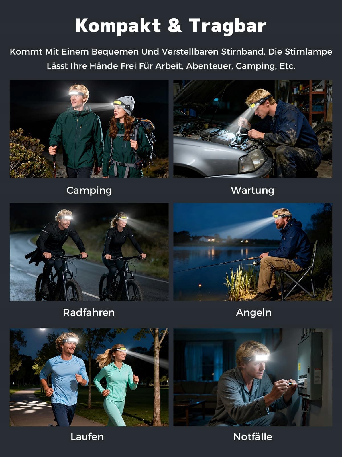 【Idealna na nocne aktywności】Niezależnie od tego, czy biwakujesz, wędrujesz, łowisz ryby czy wykonujesz prace domowe, latarka czołowa zapewnia idealną ilość światła do wszystkich twoich nocnych aktywności.