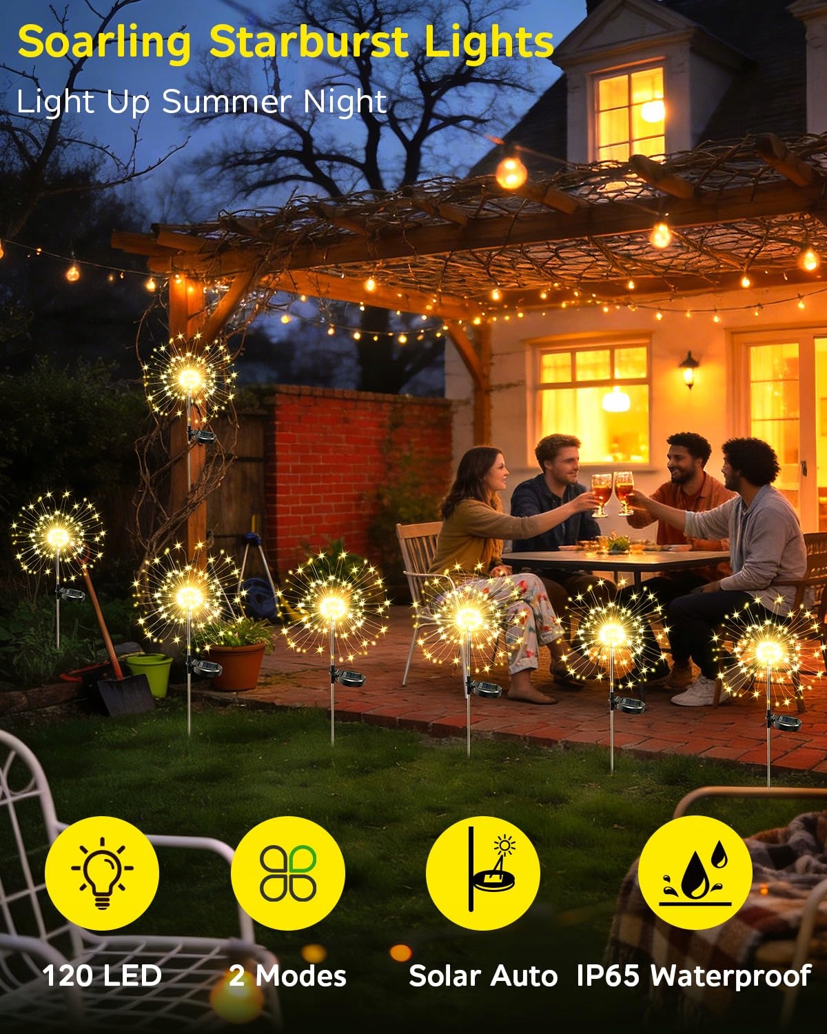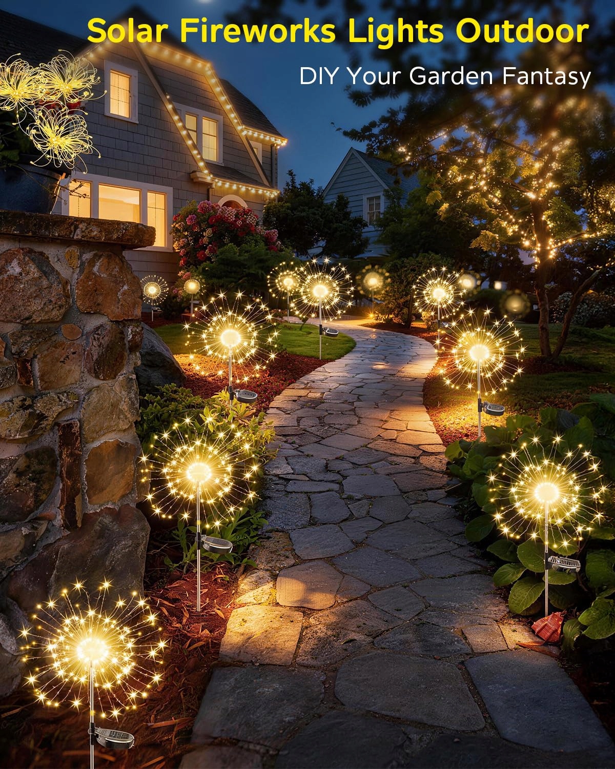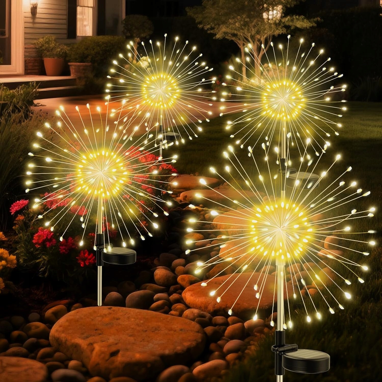 Soarling Solarne światła fajerwerków, zewnętrzne solarne lampki dekoracyjne do ogrodu, 480 diod LED, zestaw 4 sztuk, lampki ogrodowe, światło gwiazd, wodoodporna lampa zewnętrzna na trawnik, podwórko, chodnik – ciepła biel
