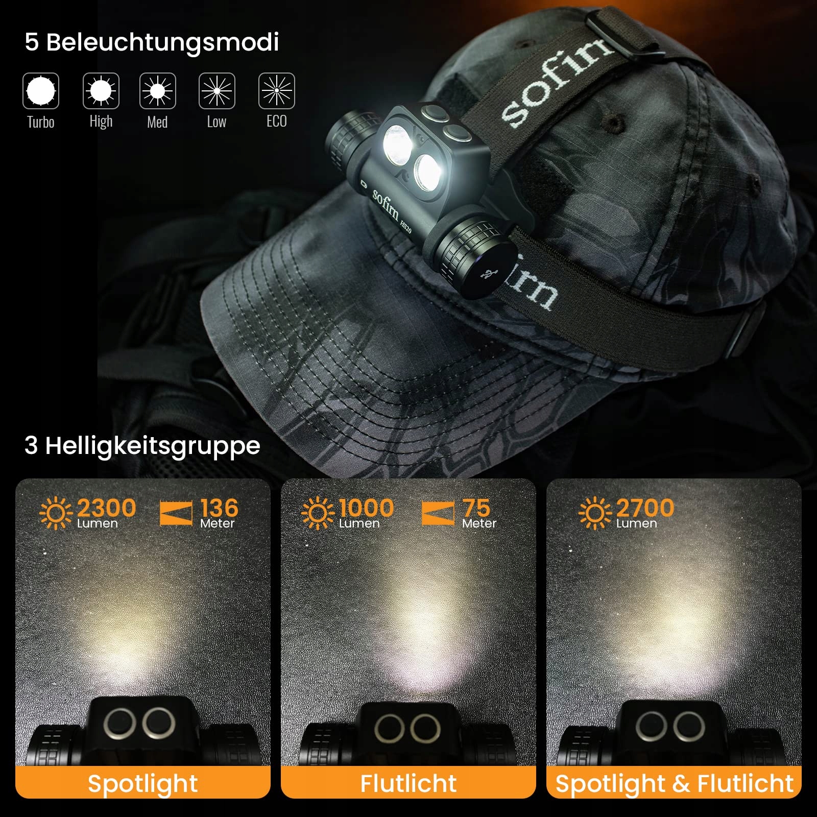 Sofirn mocna latarka czołowa 2700 lumenów, HS20 ładowana LED latarka czołowa z podwójnymi diodami LED EDC z ładowaniem typu C, 5 trybów jasności, funkcja Thrower & Flood do kempingu, wędkowania