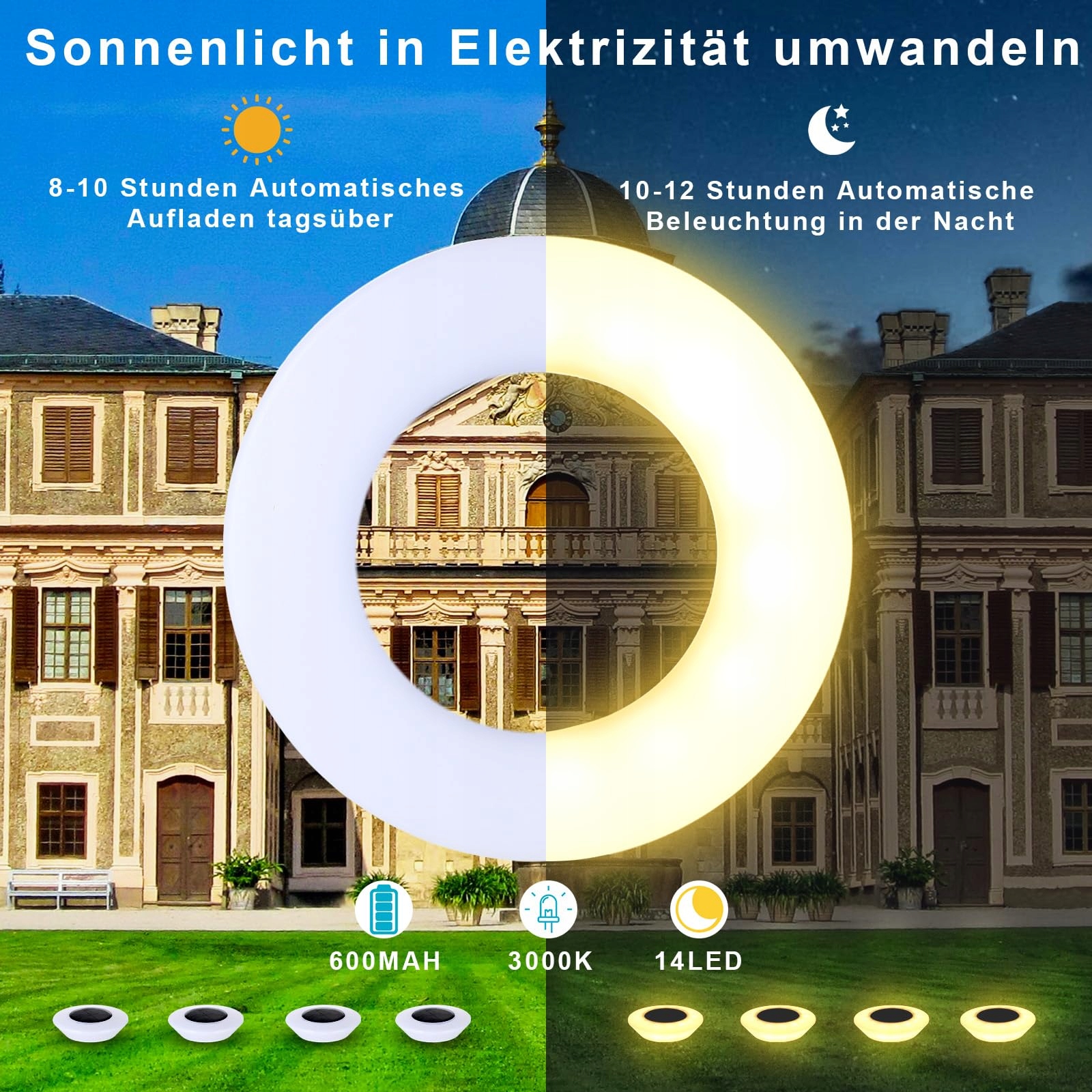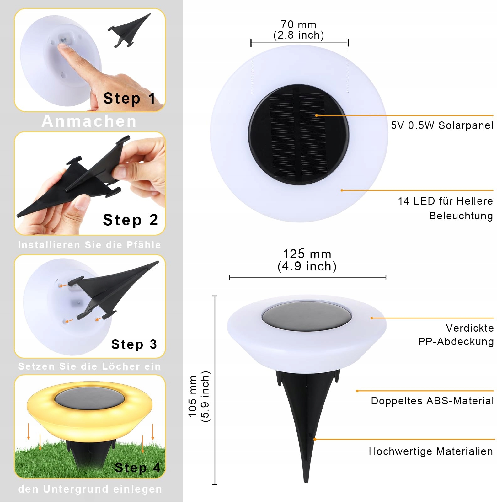 Ultra jasne 14 LED i automatyczne włączanie/wyłączanie: Lampa solarna stojąca z 14 ultra jasnymi diodami LED, wbudowany akumulator 600mAh, który można ładować przez 8-10 godzin w ciągu dnia, lampa solarna może świecić do 10-12 godzin w nocy. Te lampy solarne emitują silne światło o jasności 10-12 lumenów, wysoka efektywność konwersji energii słonecznej, oszczędza koszty energii, zapewniając większą powierzchnię oświetlenia oraz jasną i przyjazną atmosferę.