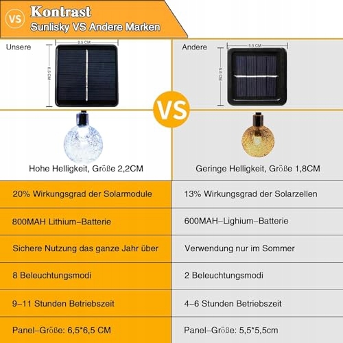 �[Ekologiczny i energooszczędny panel solarny 800 mAh]Mały łańcuch świetlny solarny na zewnątrz z zaawansowaną technologią ogniw słonecznych, która zapewnia wskaźnik konwersji energii powyżej 20%, pozwala oszczędzać prąd i pieniądze, co umożliwia prowadzenie zrównoważonego życia i poprawę jakości życia. Dzięki zwiększonej pojemności baterii 800mAh, łańcuch świetlny solarny ładuje się w ciągu dnia przez 6-8 godzin, oferując 10-12 godzin pracy w nocy.