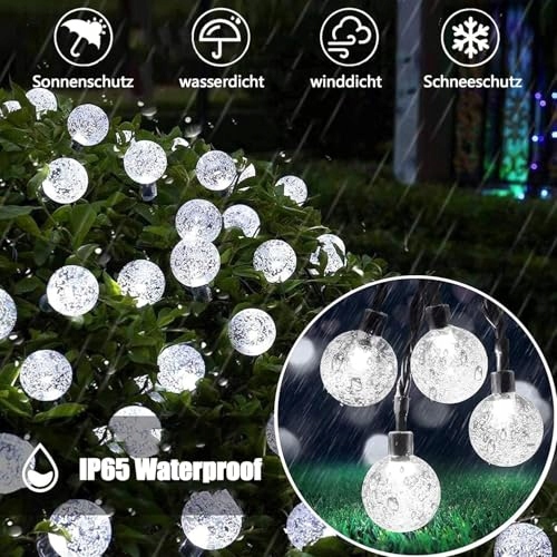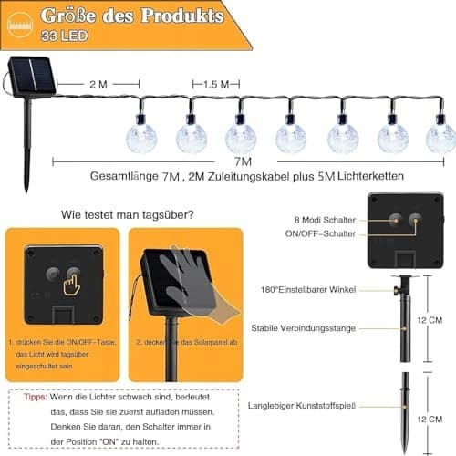 💡[Wodoodporność IP65]Łańcuch świetlny solarny wykonany z wysokiej jakości materiału ABS i przetestowany pod kątem wodoodporności IP65, może wytrzymać wszystkie warunki pogodowe, nawet silny deszcz i śnieg, co czyni go idealnym do dekoracji wewnątrz i na zewnątrz. 33 wysokiej jakości łańcuchy świetlne solarne na zewnątrz, długość lampy 5 m i 2 m kabla, całkowita długość 7 m.