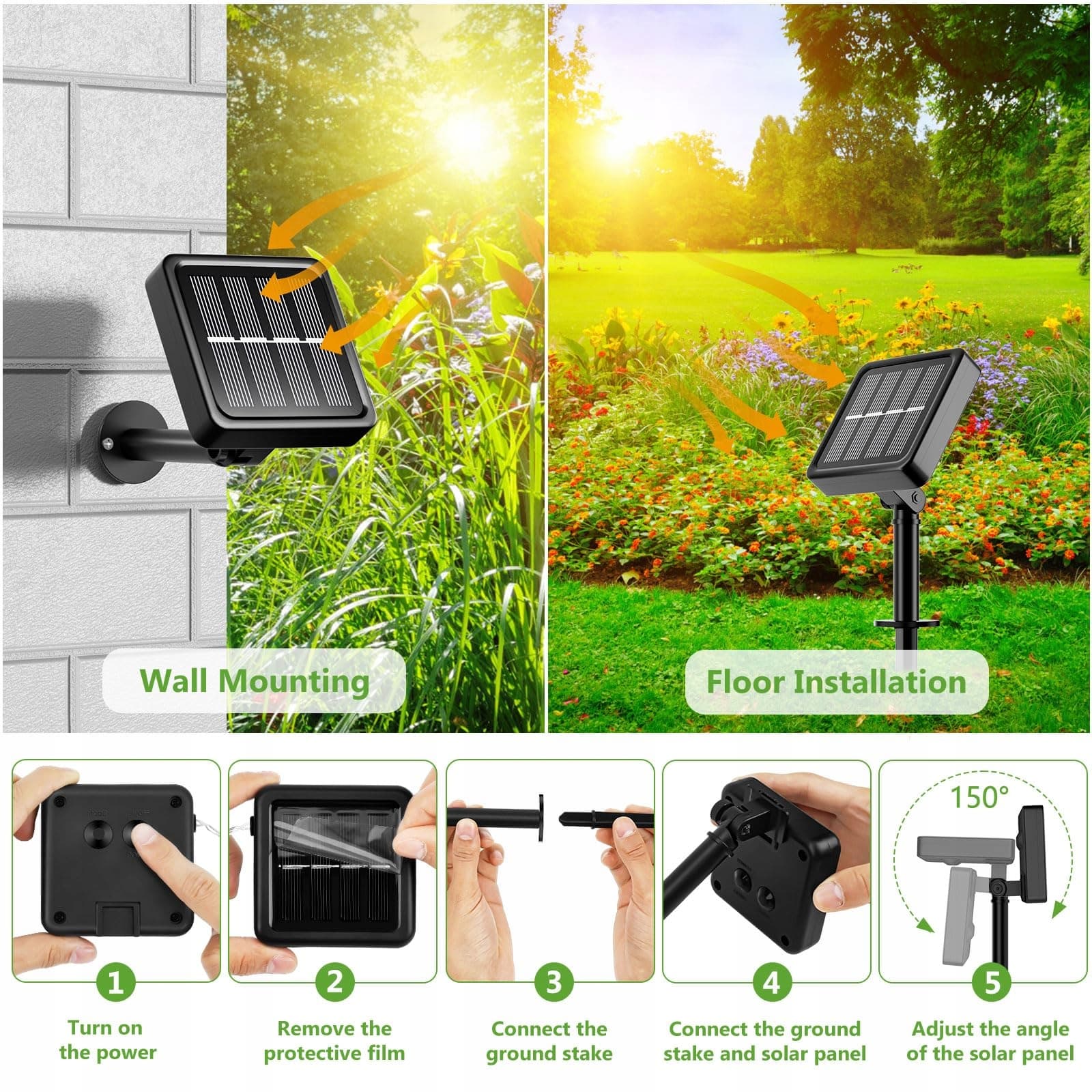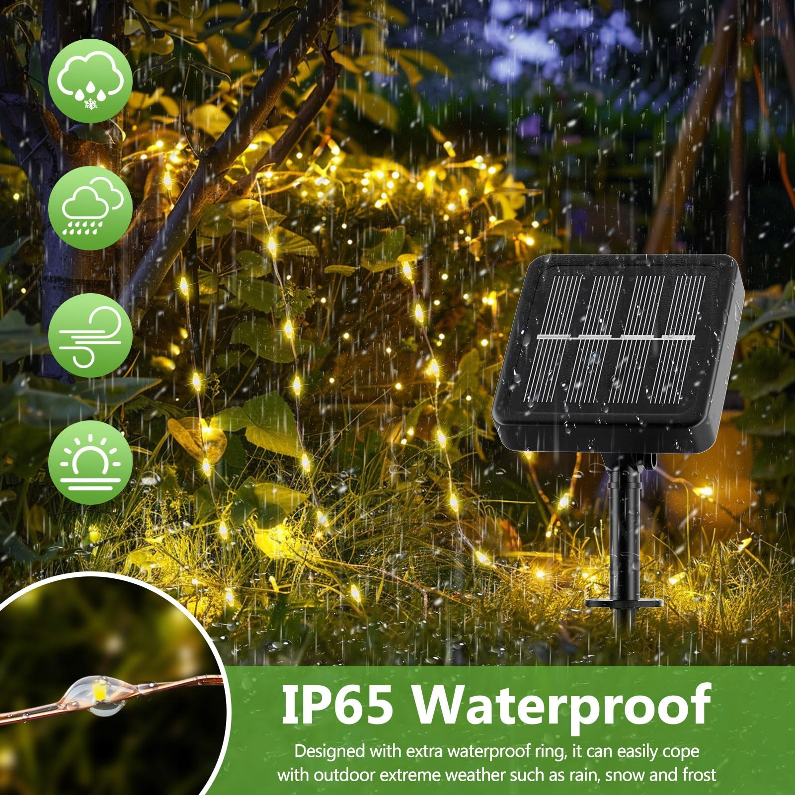 [Wodoodporność IP65 & Szerokie Zastosowania] Wodoodporność łańcucha świetlnego solarnego na zewnątrz osiąga IP65, zaprojektowany z dodatkowym wodoodpornym pierścieniem, który może być używany w każdych warunkach pogodowych, w tym deszczu, śniegu, kurzu, mrozu lub innych. Nadaje się do użytku wewnątrz i na zewnątrz, takich jak ogrody, balkony, tarasy, trawniki, płoty, bramy, kempingi, wesela, imprezy, Boże Narodzenie, Halloween i wydarzenia świąteczne