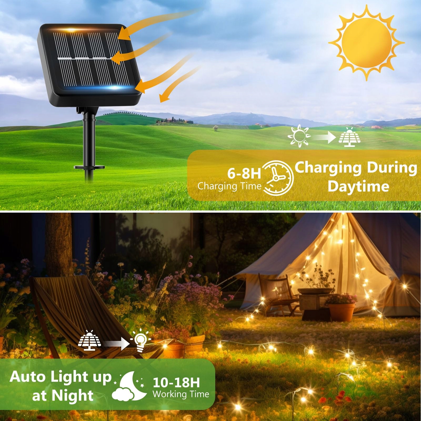 [Nowo Ulepszone Panele Słoneczne & Bateria 1000mAh] Łańcuch świetlny solarny na zewnątrz jest wyposażony w baterię 1000 mAh i ulepszony monokrystaliczny panel słoneczny, który jest większy (8*8cm), ma lepszą wydajność i współczynnik konwersji do 22%. Pełne naładowanie w świetle słonecznym zajmuje tylko 6-8 godzin i świeci przez 10-18 godzin w nocy