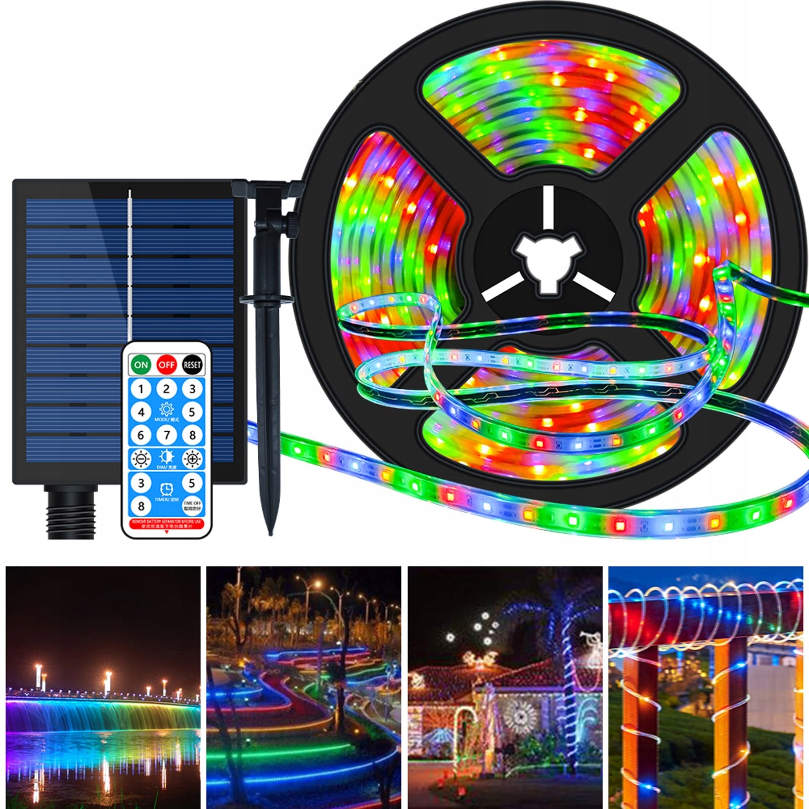 Solarny pasek LED ze zmieniającymi się kolorami: 10-metrowy pasek LED z 560 diodami LED 2835 z kątem widzenia 360 stopni, który świeci we wszystkich kierunkach. 8 trybów oświetlenia: migotanie, błysk, ścigający błysk, stałe światło itp. Zawiera tradycyjne kolory RGBY oraz 4 inne kolory.