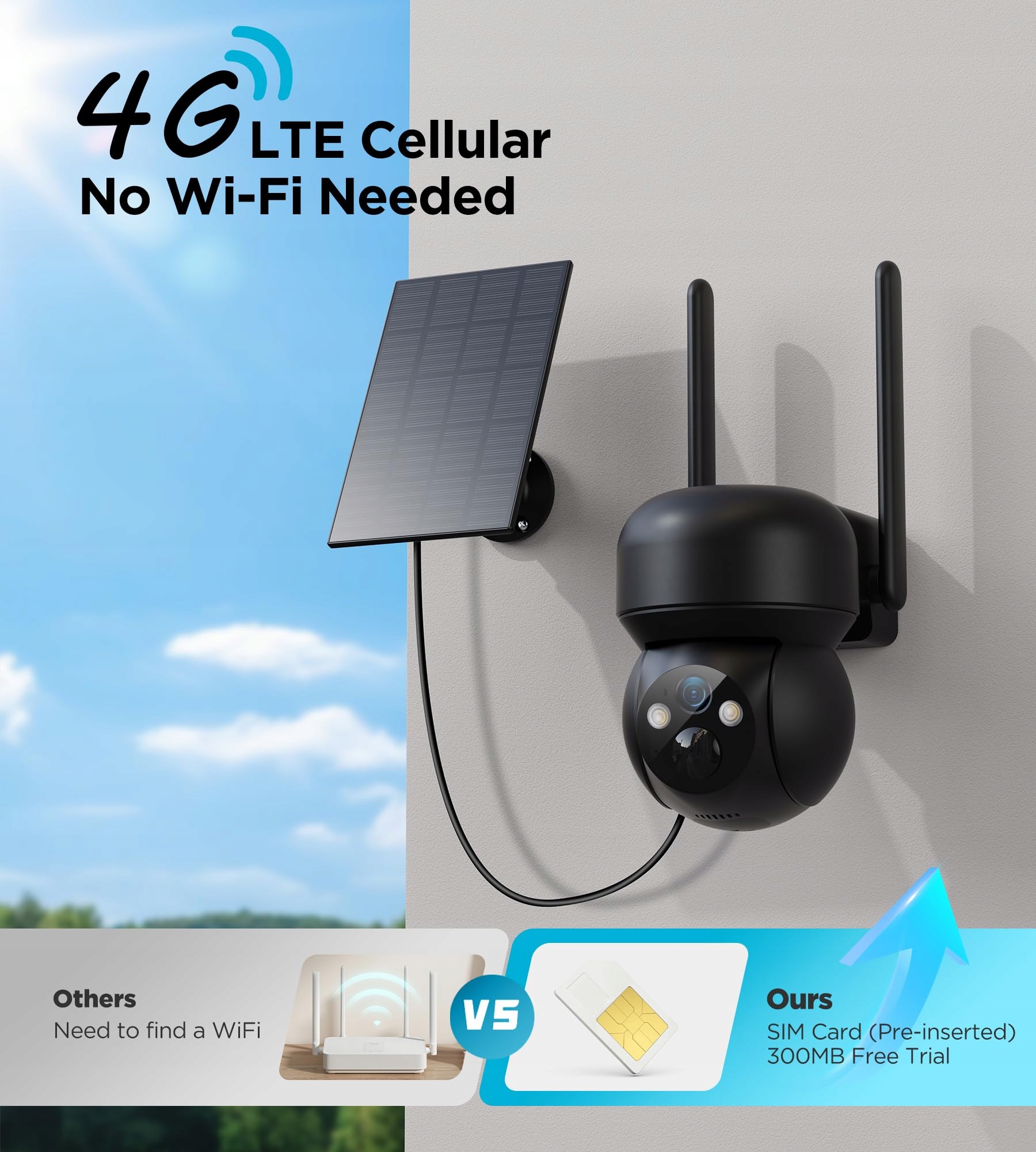 【BEZ WIFI & 100% Bezprzewodowa】Ta 4G solarna kamera bezpieczeństwa ma wbudowaną kartę SIM i nie wymaga uciążliwych kabli, łatwa w instalacji. Ta 4G bezprzewodowa kamera bezpieczeństwa wystarczy, że zostanie podłączona do panelu słonecznego i może działać non-stop przez 365 dni, aby chronić Twoje bezpieczeństwo. Ta kamera z kartą SIM jest wyposażona w kartę SIM i nie musisz się już martwić o brak połączenia bezprzewodowego na zewnątrz, ponieważ możesz stabilnie przesyłać obrazy za pomocą 4G karty SIM. Po zakończeniu okresu testowego karty SIM musisz wykupić pakiet danych w aplikacji, aby nadal korzystać z kamery.