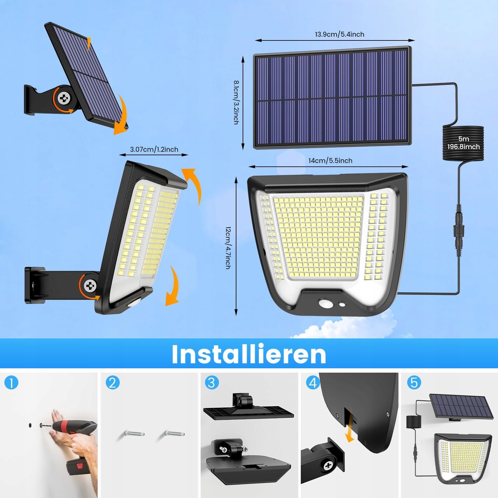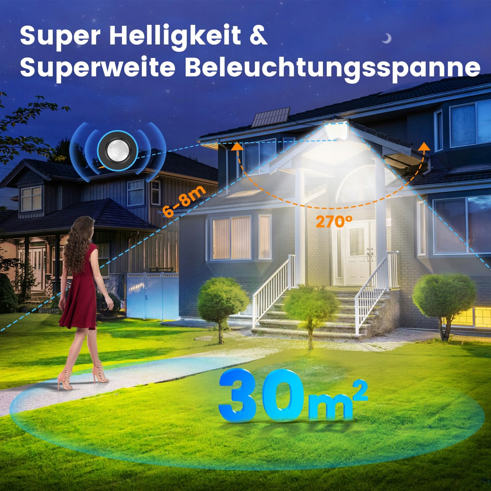 Ultra jasne 288 diod LED i 270° detekcja wokół: Profesjonalne solarne lampy bezpieczeństwa z 288 wysokiej jakości diodami LED i zimnym światłem 6500K zapewniają krystalicznie czyste, dzienne oświetlenie. Czujnik ruchu o szerokim kącie 270° jednocześnie monitoruje wejścia, garaże, narożniki ogrodu oraz trudno dostępne miejsca, takie jak tarasy, balkony czy klatki schodowe.
