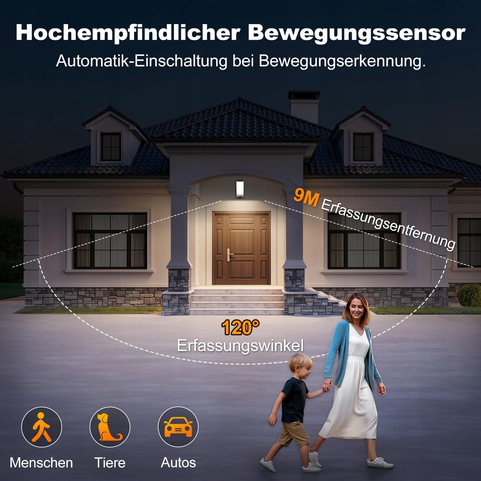 🦉 Wysokoczuły czujnik PIR - lampa zewnętrzna LED z czujnikiem ruchu: Niezawodne wykrywanie ruchu do 9 metrów z kątem detekcji 120°. Trzy praktyczne tryby: tryb włączony (ciągłe światło), tryb automatyczny (aktywowany ruchem) oraz tryb bezpieczeństwa (czerwone migające światło) – do różnych sytuacji użytkowania. Czuły czujnik ruchu na zewnątrz umożliwia również zwierzętom domowym bezpieczną i wygodną aktywność nocną wokół domu.