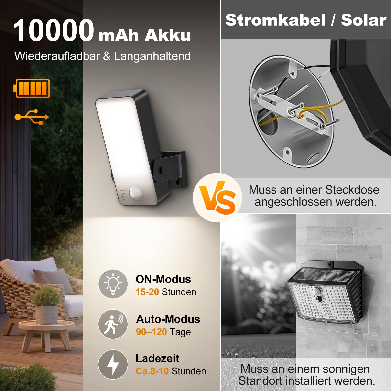 🔋 Ultra długi czas pracy i szybkie ładowanie - 10000 mAh akumulator kinkietu: Do 120 dni w trybie automatycznym (ok. 10 ruchów/dzień) oraz do 20 godzin ciągłego świecenia po pełnym naładowaniu w trybie włączonym. Czas ładowania tylko 8–10 godzin. Nie wymaga częstej wymiany baterii. Ta ładowalna lampa zewnętrzna LED – w przeciwieństwie do lamp solarnych – zapewnia ciągłe jasne światło, nawet przy zachmurzonym niebie, w cieniu lub zimą.