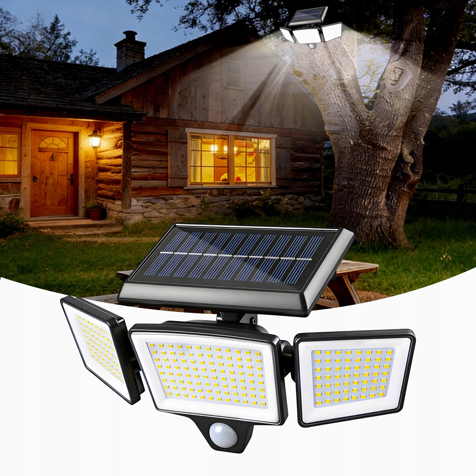 Lampa solarna z czujnikiem ruchu, 208 LED i 1200LM superjasna, 270° szeroki kąt oświetlenia bezpieczeństwa, wodoodporna IP65, lampa ścienna do ogrodu, tarasu, podwórka, garażu – od zmierzchu do świtu