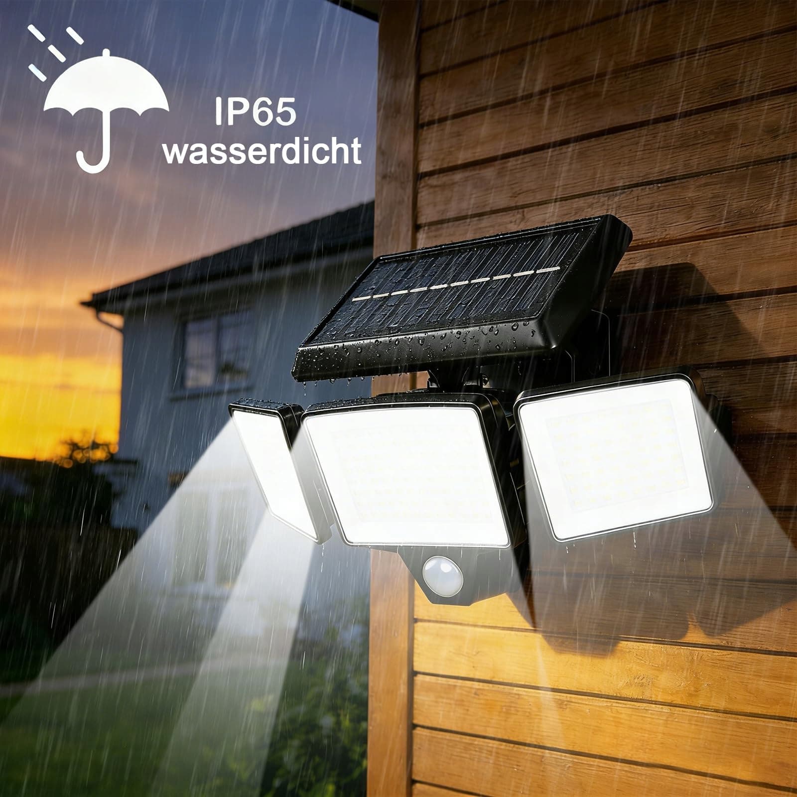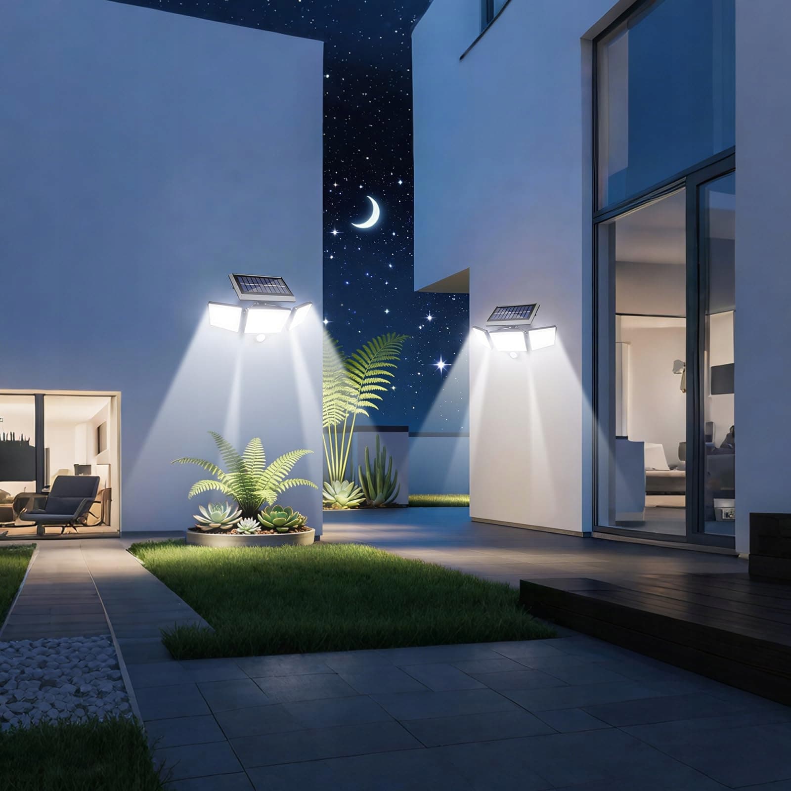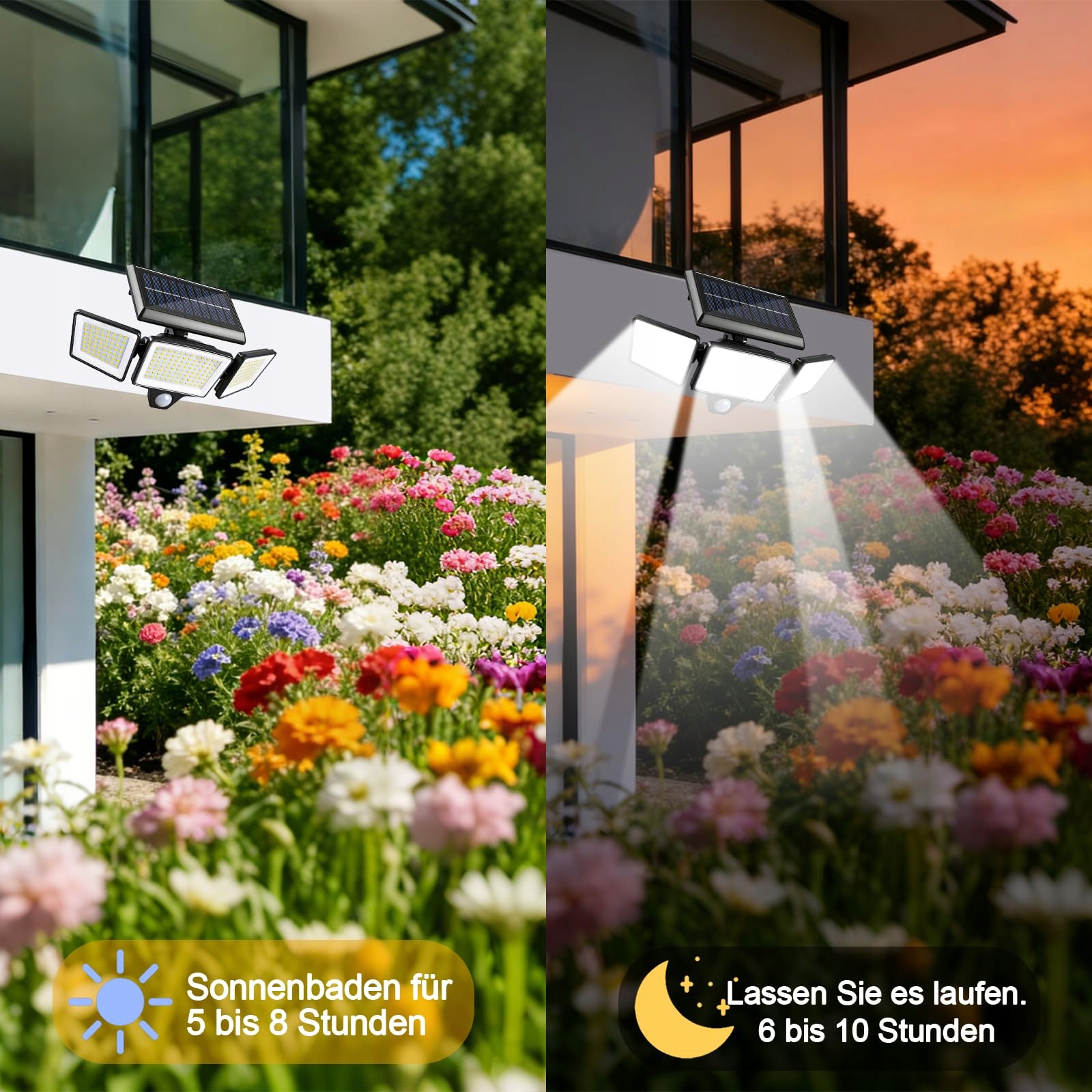 【270° ultra szeroki kąt pokrycia i 1200 lumenów jasności światła dziennego】 Pożegnaj się z ciemnymi zakamarkami. W przeciwieństwie do tradycyjnych reflektorów o wąskim kącie światła, nasza lampa solarna posiada trzy regulowane głowice lamp, które można obracać, aby pokryć ogromny kąt 270°. Wyposażona w 208 wysoko wydajnych diod LED dostarcza mocne światło o jasności 1200 lumenów z symulacją światła dziennego, zapewniając wyraźną widoczność każdego zakątka Twojego ogrodu, podjazdu czy garażu.