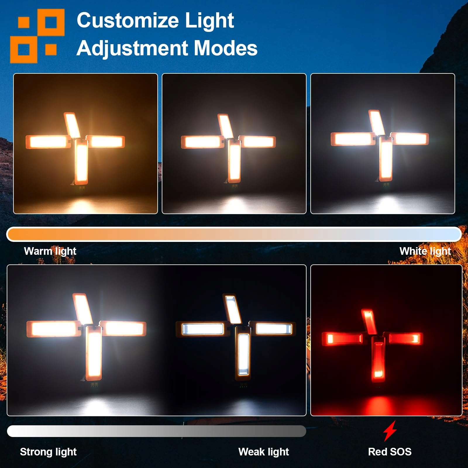 【Swobodnie obracające się listwy świetlne】Reflektor LED z akumulatorem wyposażony w cztery głowice lamp LED zapewnia lepsze oświetlenie. Dzięki możliwości regulacji pionowej o 180° i obrotowi poziomemu o 270° można oświetlić każdy pożądany kąt.