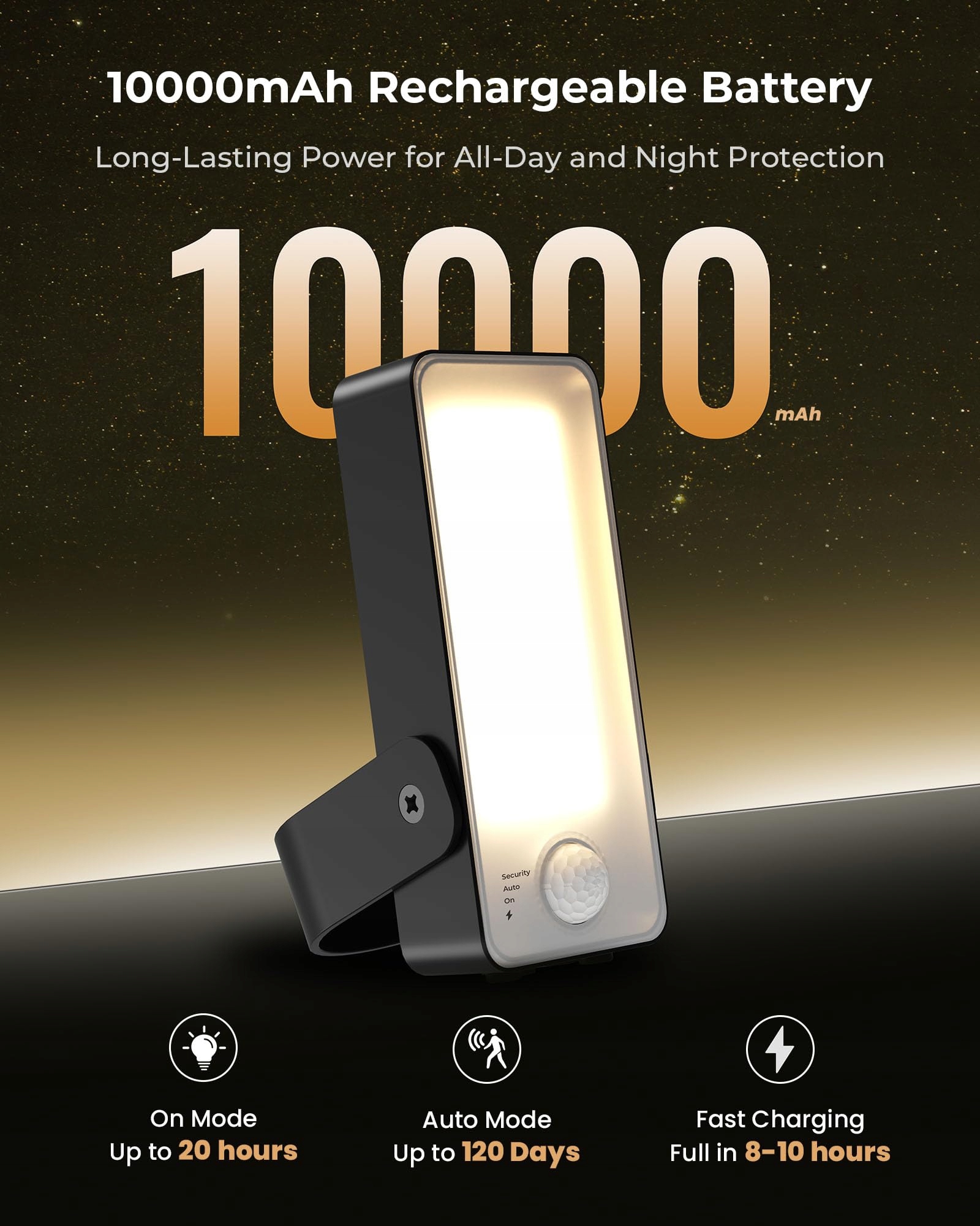 🔋 Trwały akumulator 10000mAh: Ta lampa zewnętrzna z czujnikiem ruchu posiada wydajny akumulator 10 000mAh i zapewnia światło do 120 dni na jedno ładowanie (przy około 10 aktywacjach dziennie). W przeciwieństwie do lamp solarnych, oferuje stałe jasne oświetlenie nawet przy pochmurnej pogodzie, w cieniu lub zimą. Dzięki szybkiemu ładowaniu USB-C lampa jest w pełni naładowana w ciągu zaledwie 8–10 godzin – bez częstego doładowywania i wymiany baterii.